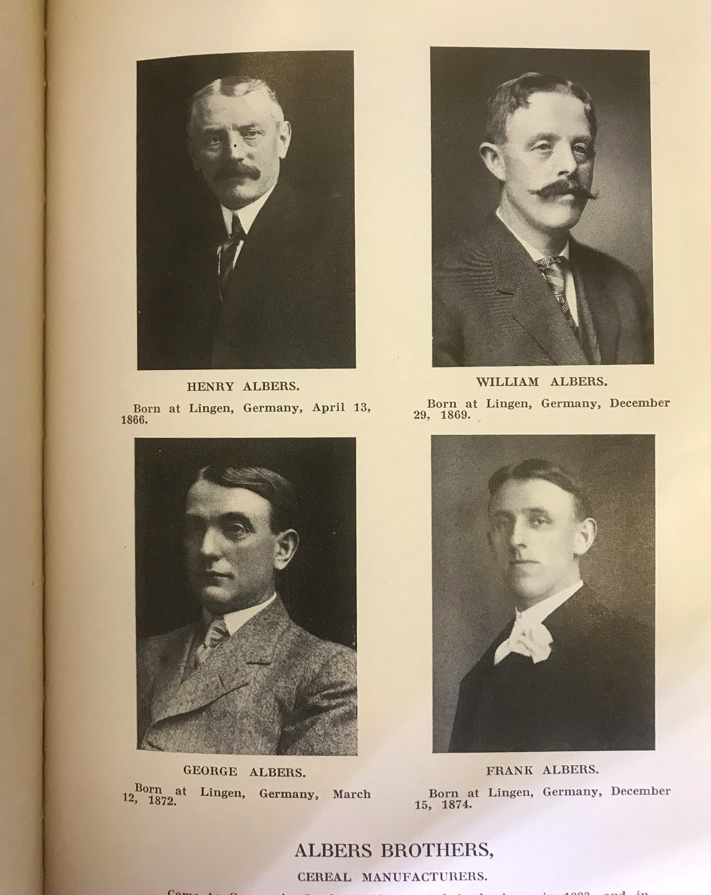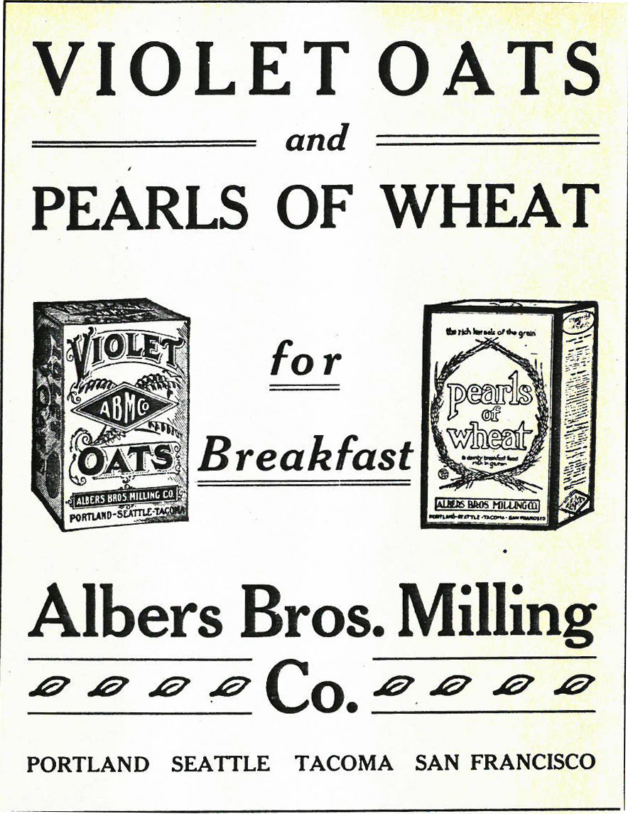 Bernard (or Bernhard) Albers emigrated from Lingen, Germany, to Indiana in 1887 and moved to Portland two years later to work as a driver for a feed merchant company—a business he had trained for with his father. At the time, wheat and flour were two of Oregon’s largest and most profitable exports, and by 1893 Albers had established his own grain business, first with Henry Tuke and then with Thomas Schneider. His large family had also emigrated from Germany, and in 1901, he and four brothers incorporated as the Albers Brothers Milling Company, which milled soft white wheat into flour and corn into meal, among other milled products. With Bernard Albers as president, they built what became the largest flour and feed milling firm on the West Coast, with mills in Tacoma, Seattle, Ogden (Utah), Los Angeles, and Oakland/San Francisco. In addition to selling its Peacock buckwheat flour, Albers Mill sold cereals that included Violet Oats, Pearls of Wheat, and Columbia Oats, as well as animal feed and hay.