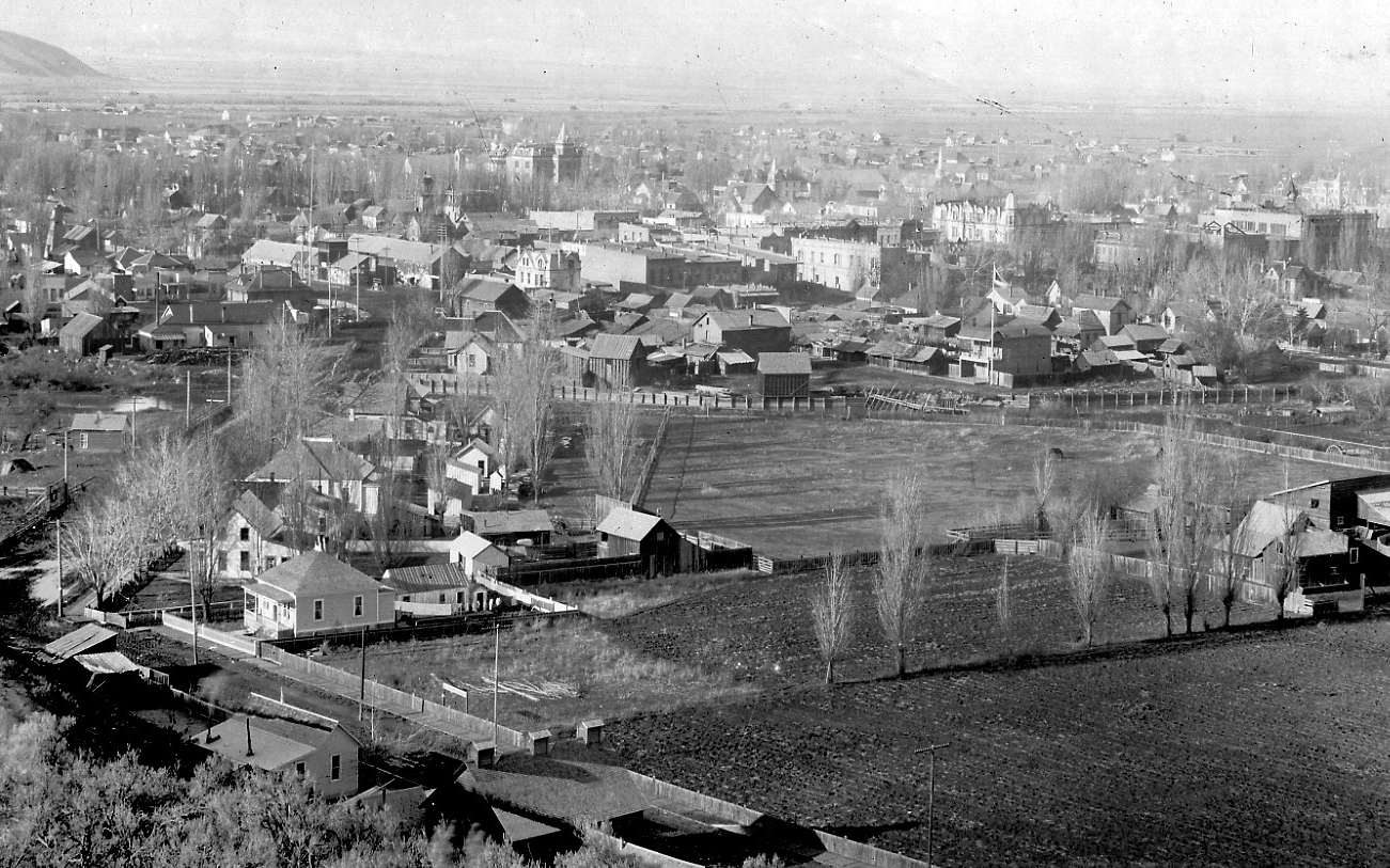 Baker City's Chinatown located from the temple flagpole to left of center, c.1900.