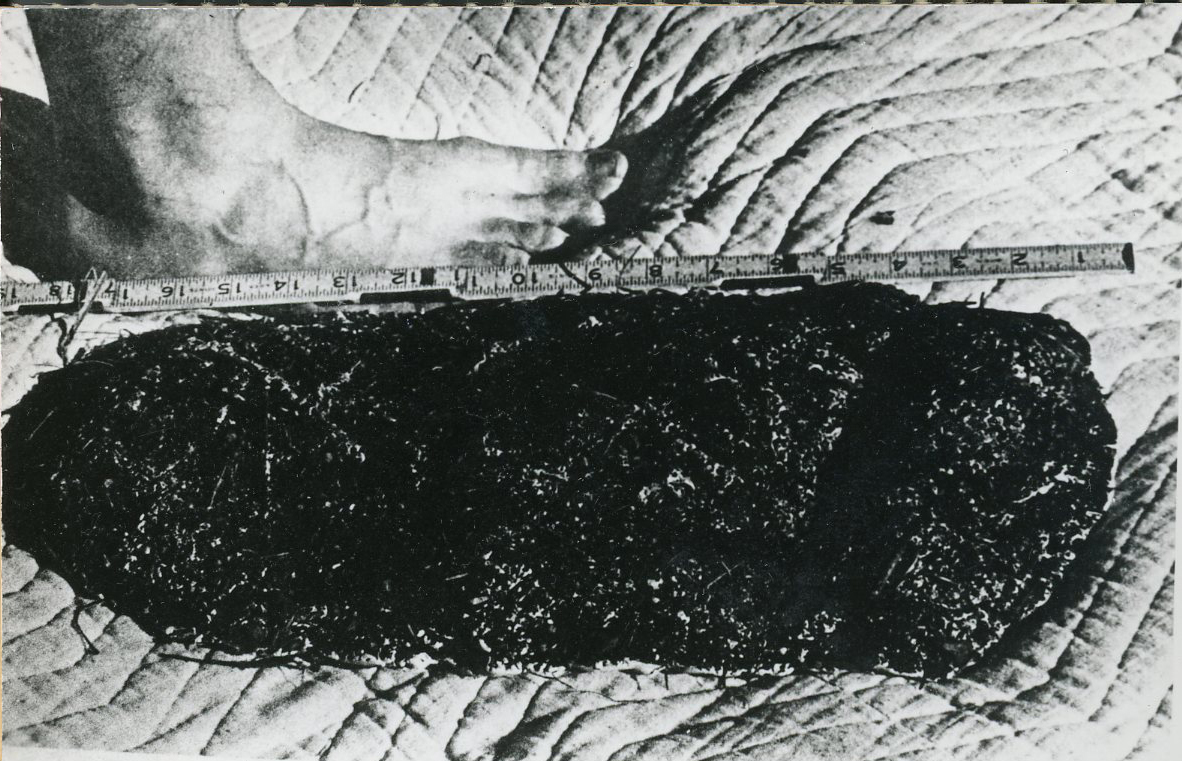The cast of a reported Sasquatch footprint nears Mt. St. Helens, 1974.