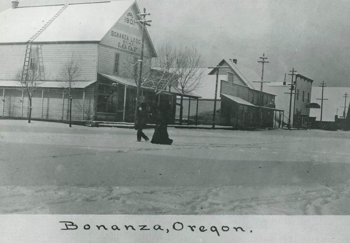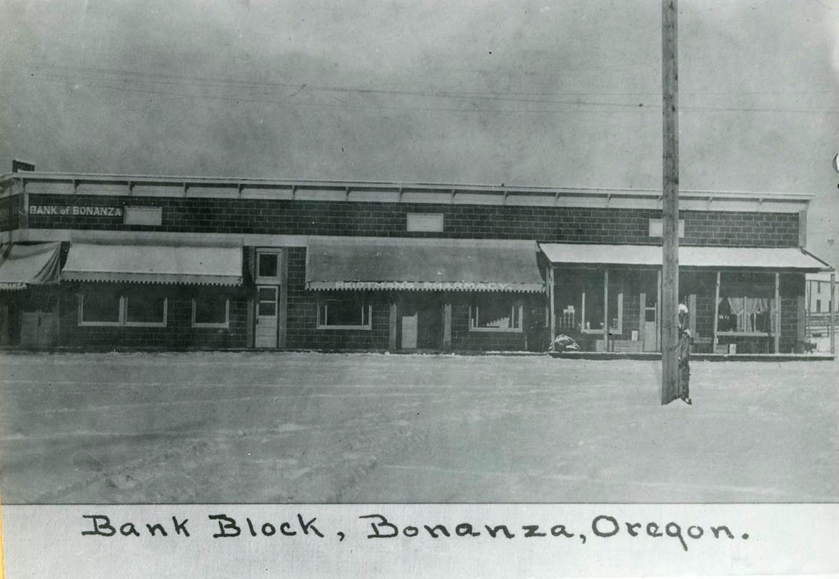 By 1910, Bonanza boasted the Shook sawmill, a hotel, blacksmith, bank, creamery, newspaper, boardinghouse, school, flourmill, slaughterhouse, and a brickyard. Cattle and grain were the region’s chief products, and Bonanza was important enough in Klamath County that it was a contender for county seat. Devastating fires, however, scorched the town in 1910, 1913, 1914, and 1930, each time destroying shops, homes, and businesses. Later fires also plagued the town, including a 1944 fire that destroyed the school.
