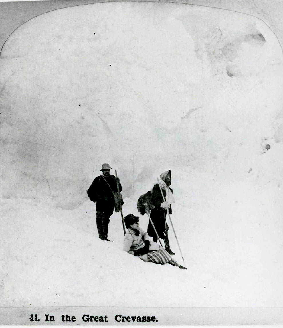 Climbers with Alpenstocks in the Great Crevasse, Mt. Hood, c. 1895.