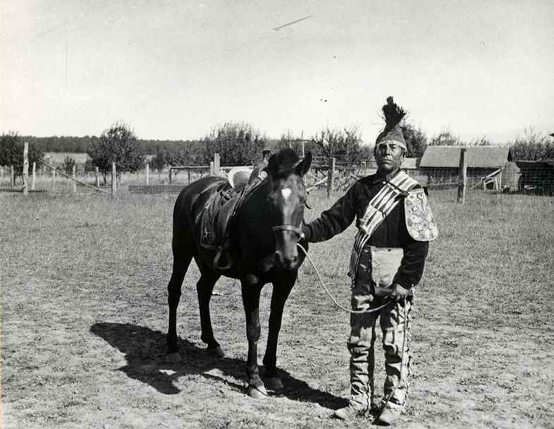 In 1913, the Oregon Pacific Railroad completed a section of rail line leading to the town of Molalla. The arrival of the first train on September 19 was cause for celebration. Yelkus was invited to be the guest of honor. Adorned in his father’s regalia, he led the procession through town on his horse. “I was born here 67 years ago,” he told reporters. “I am the last of the Molalla Indians. They named this place from our tribe. When I was a boy there were many of my people here. Now they are all gone [moved to reservations]. My hat of deerskin and flicker feathers belonged to my grandfather. But he and the old times are gone.”