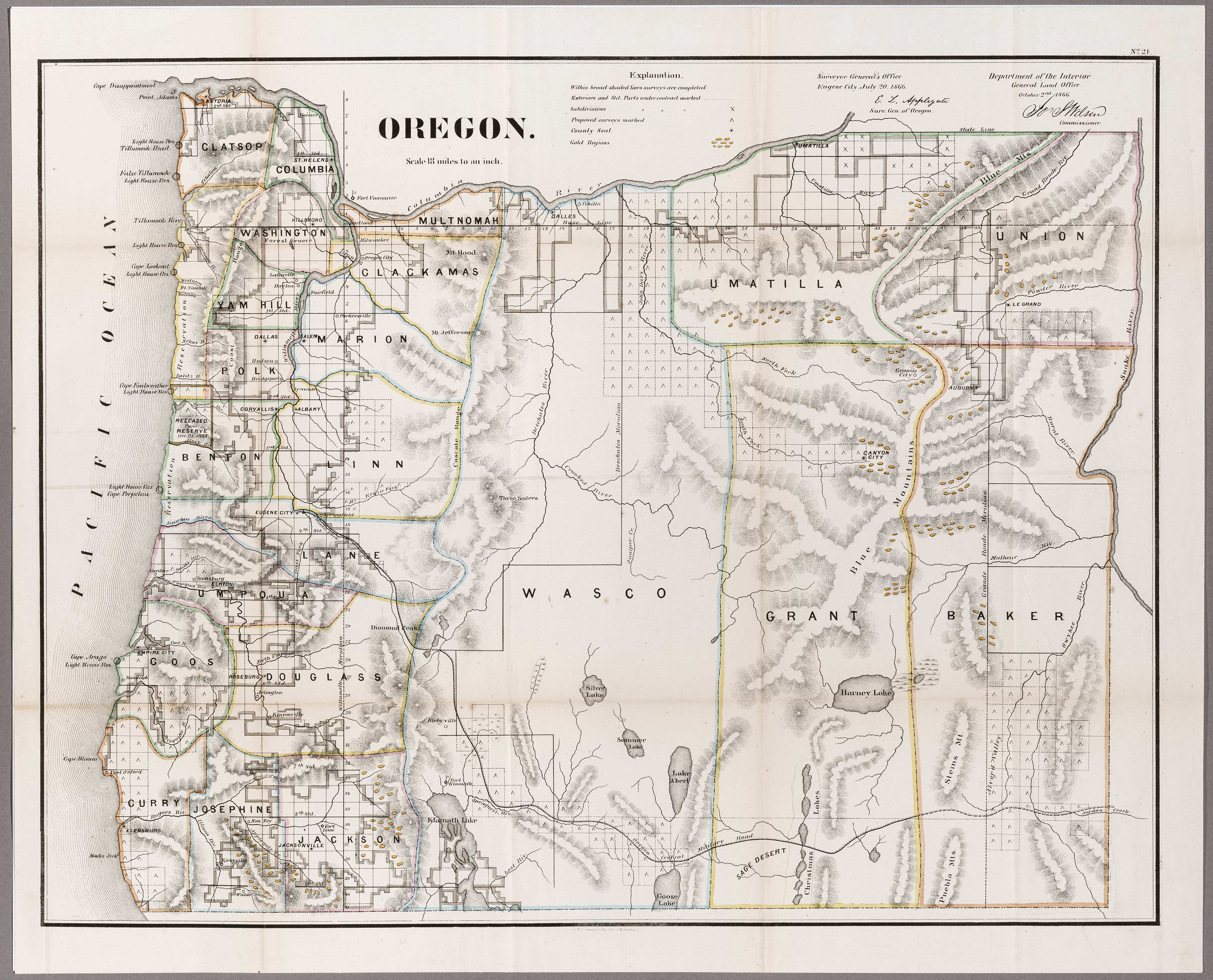 Survey map of Oregon by Lindsay Applegate, showing gold mines (marked by gold nuggets), 1866.