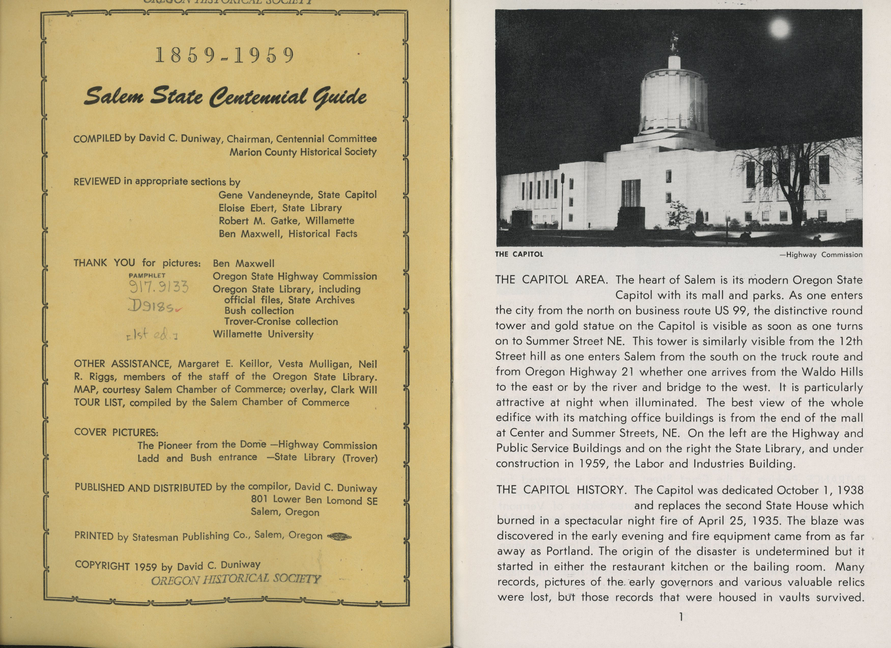 Salem State Centennial Guide, Duniway, 1959, first page.