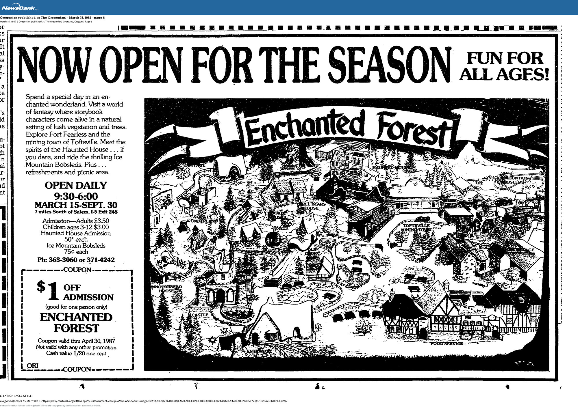 Ad for the Enchanted Forest in the Oregonian, March 15, 1987.