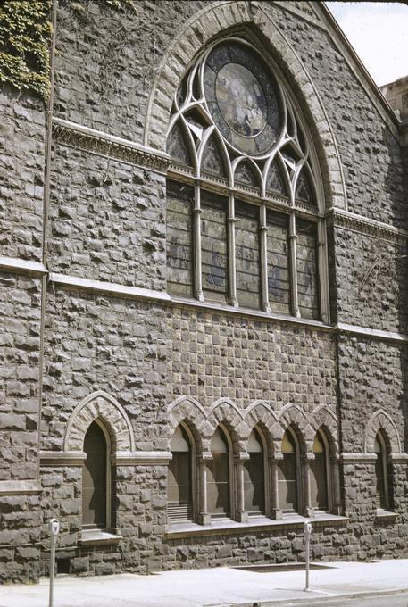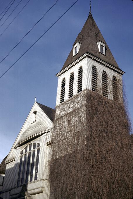 In 1957, now known simply as First Methodist, the church moved to its current four-acre campus on Southwest Eighteenth Street and Jefferson, where five buildings were constructed. Architects Donald Stewart and Kenneth Richardson designed five buildings, which were constructed using Northwest materials exclusively, including laminated arches, fir siding, and a slate roof. The value of the land and buildings was $875,000. The sanctuary holds nine hundred people, and its stained glass window is the largest of its kind in the Northwest. The seventy-five-foot, forty-ton tower houses Portland's oldest bell, cast in 1850 at Meneely's Foundry in Troy, New York, and purchased by Methodist Episcopal. After uniting nationally with the Evangelical United Brethren Church in 1968, the church changed its name to First United Methodist.