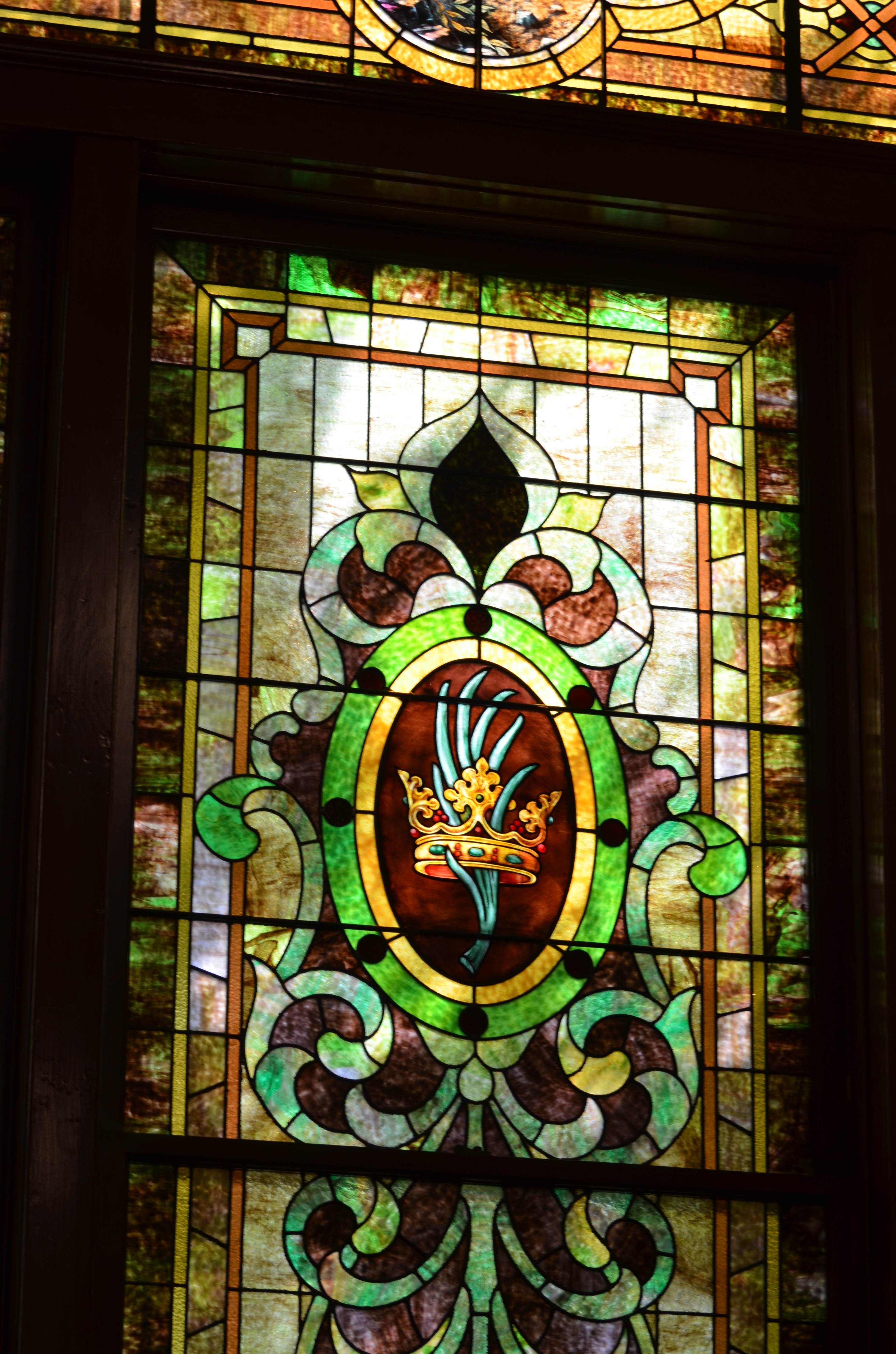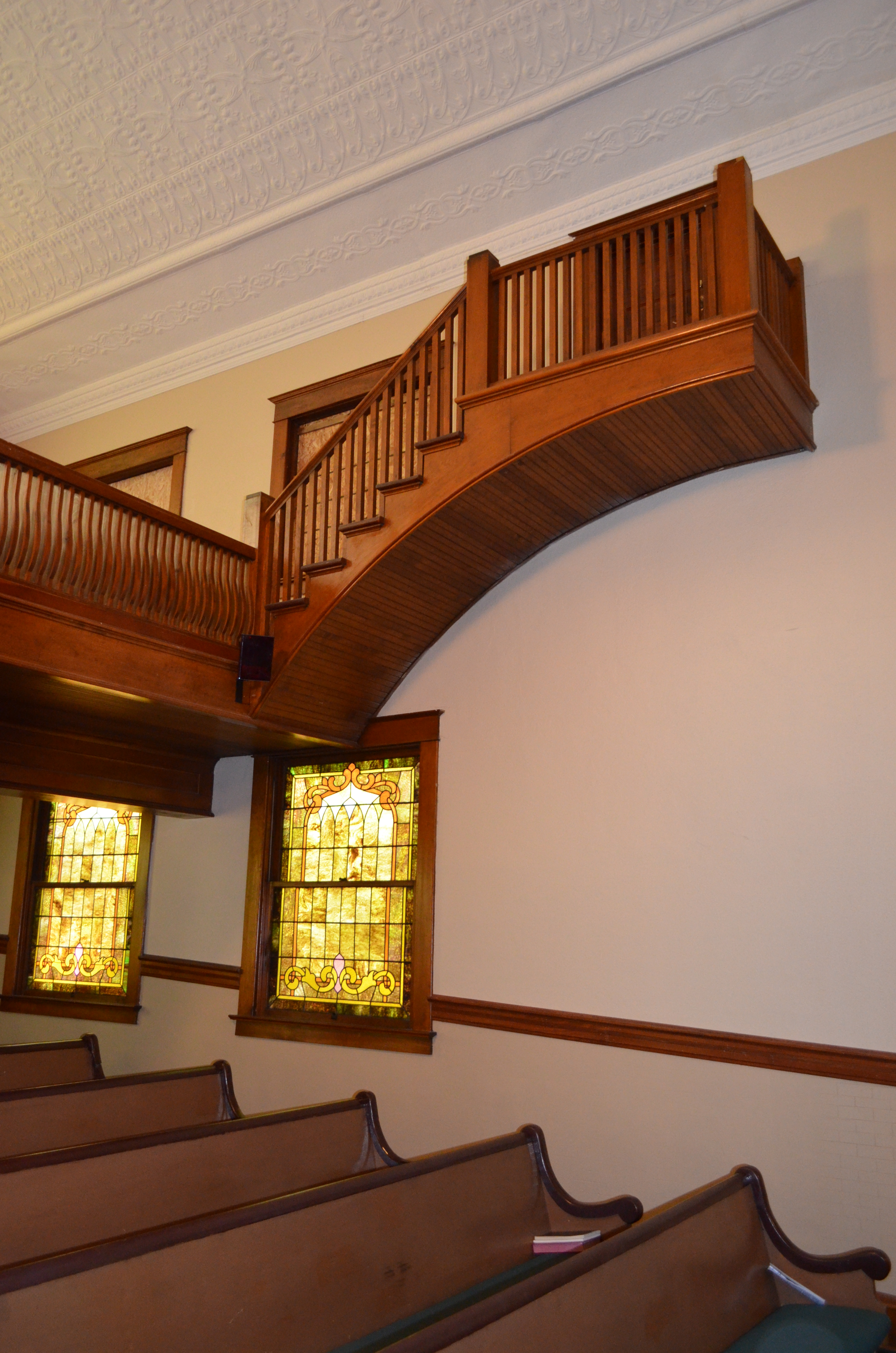 Twenty-six stained glass windows were crafted for the church by the Povey Brothers of Portland. The glass, imported from Kokomo, Indiana, was designed, painted, and assembled in Povey’s studio, and the windows were installed during the 1908 rebuilding project. The large façade arch consists of a set of four stained glass windows with Christ Praying in the Garden of Gethsemane at the top. Most of the other windows feature Art Nouveau designs as well as selected Christian motifs such as the Alpha and the Omega, a dove, a sheaf of wheat with a scythe and rake, and crosses. A pair of windows to the west of the altar features a commemorative inscription: “In memory of the pioneer founders of this Church, who builded [sic] better than they knew.”