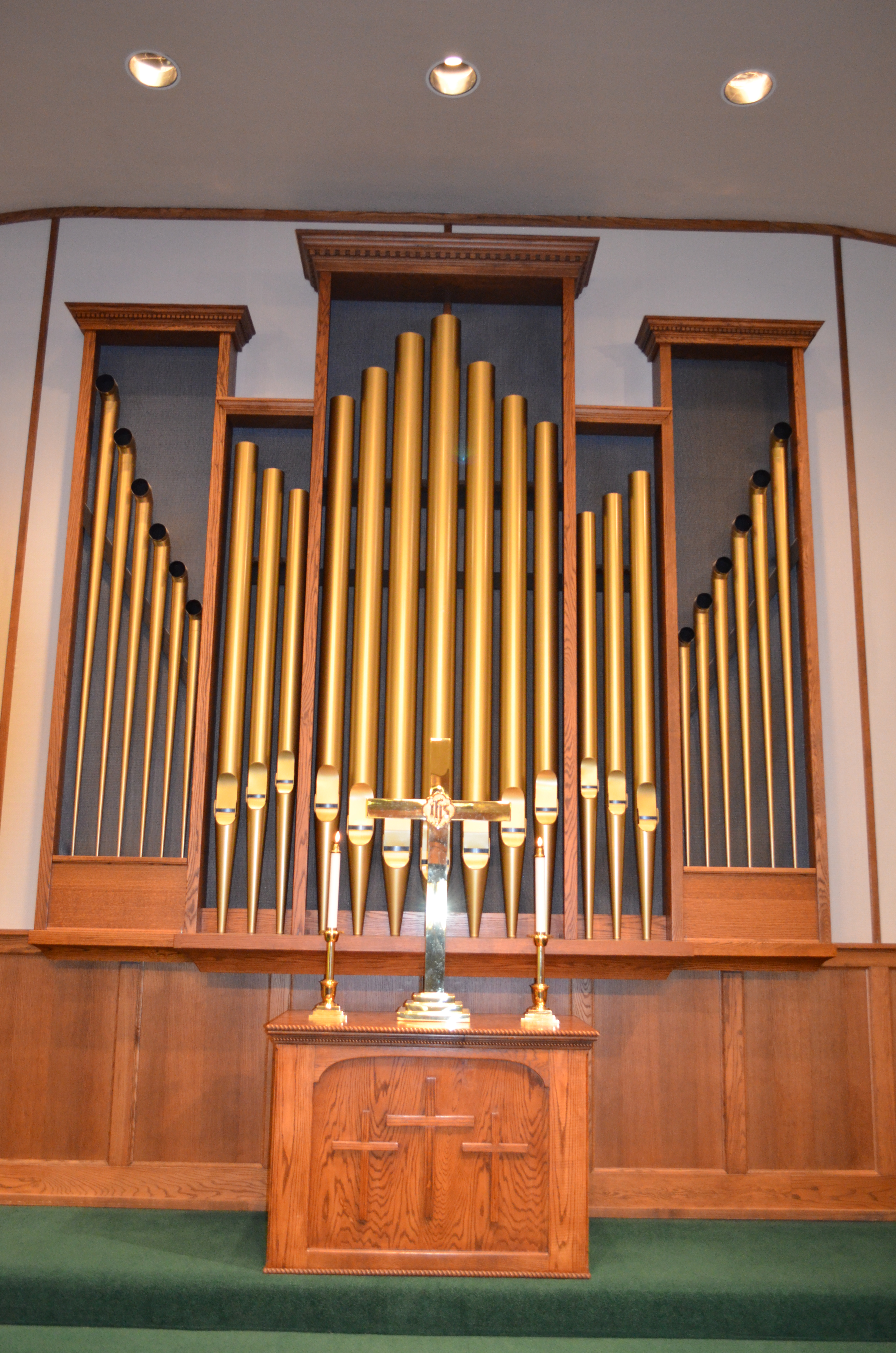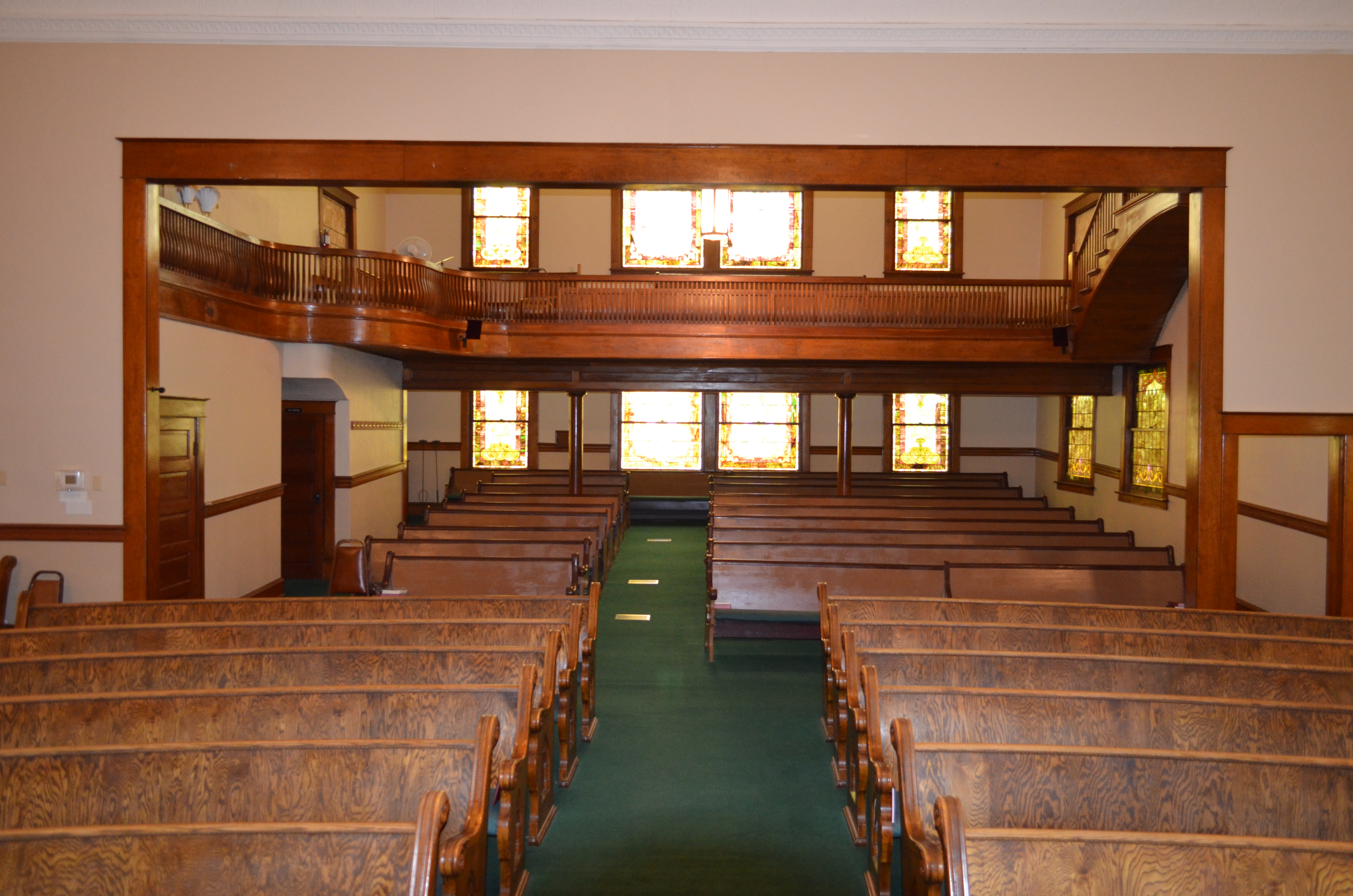 The interior of the church is oriented with the front altar to the south and a rear balcony with balustrade to the north. An elegant tin ceiling with embossed white tiles displays interlaced and crossed acanthus patterns. A Reuter pipe organ, installed in 1929, is located behind the altar. Pipes were added to the instrument in 1989, and a polished brass Fanfare Trumpet made by Hochhalter was installed in 2004 in honor of Beverly Smith, wife of the pastor Rev. Smith. The church is known for its music programs.