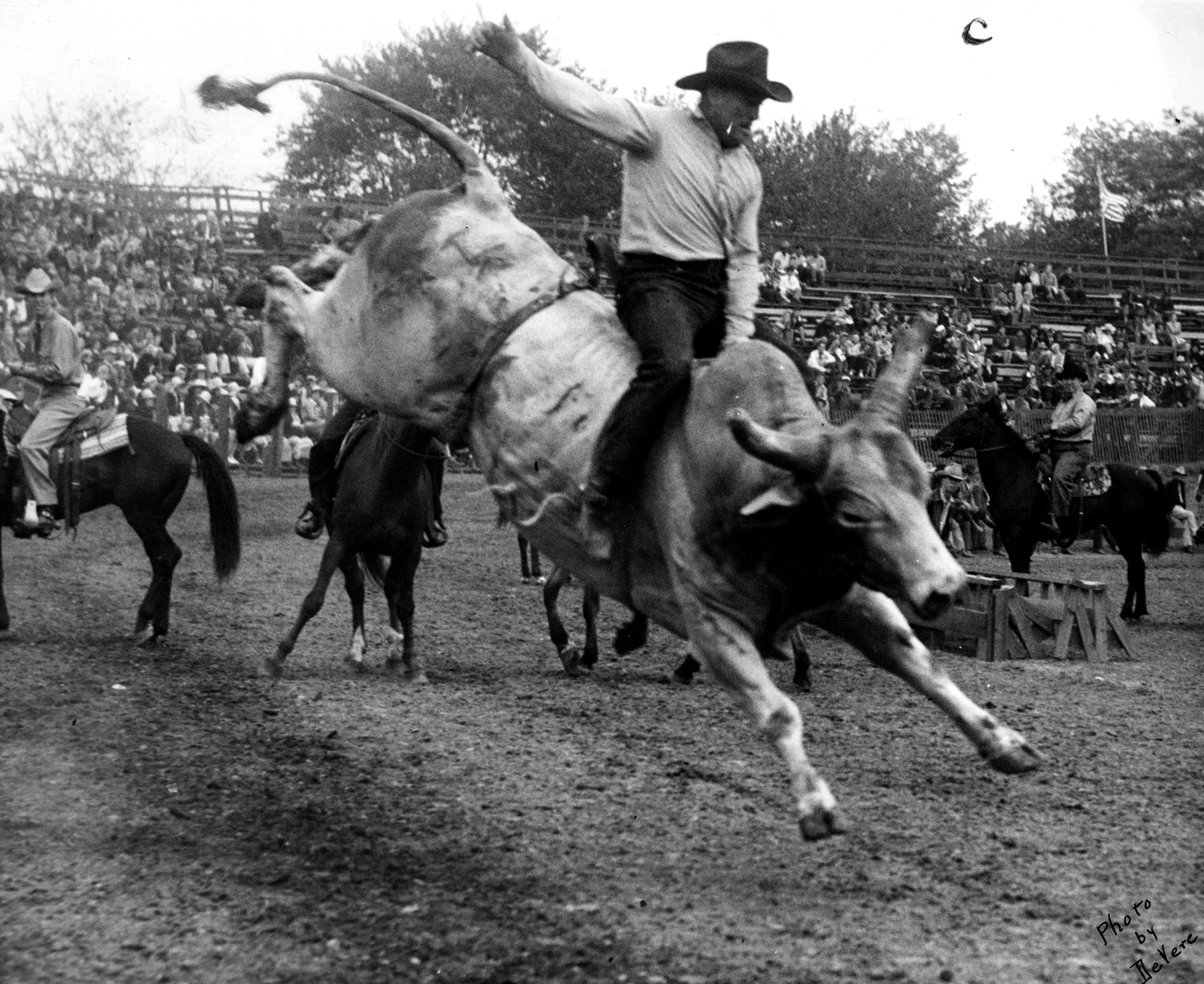 Cowboys complained to officials about photographers and tried to keep them out of the arena because they caused distractions or got in the way, but DeVere Helfrich was always careful not to disturb the riders or the animals. The cowboys liked and respected him and made room for him to climb on the fence when danger threatened. DeVere was hit twice—once by a horse used to pick up riders and once when he was rolled by a bull—but was never injured.
