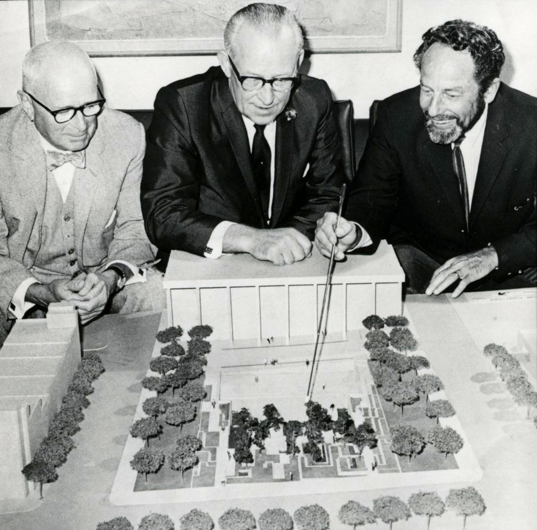 Keller, Lawrence Halpren, and Terry Schrunk show off model of Forecourt Fountain, 1961.