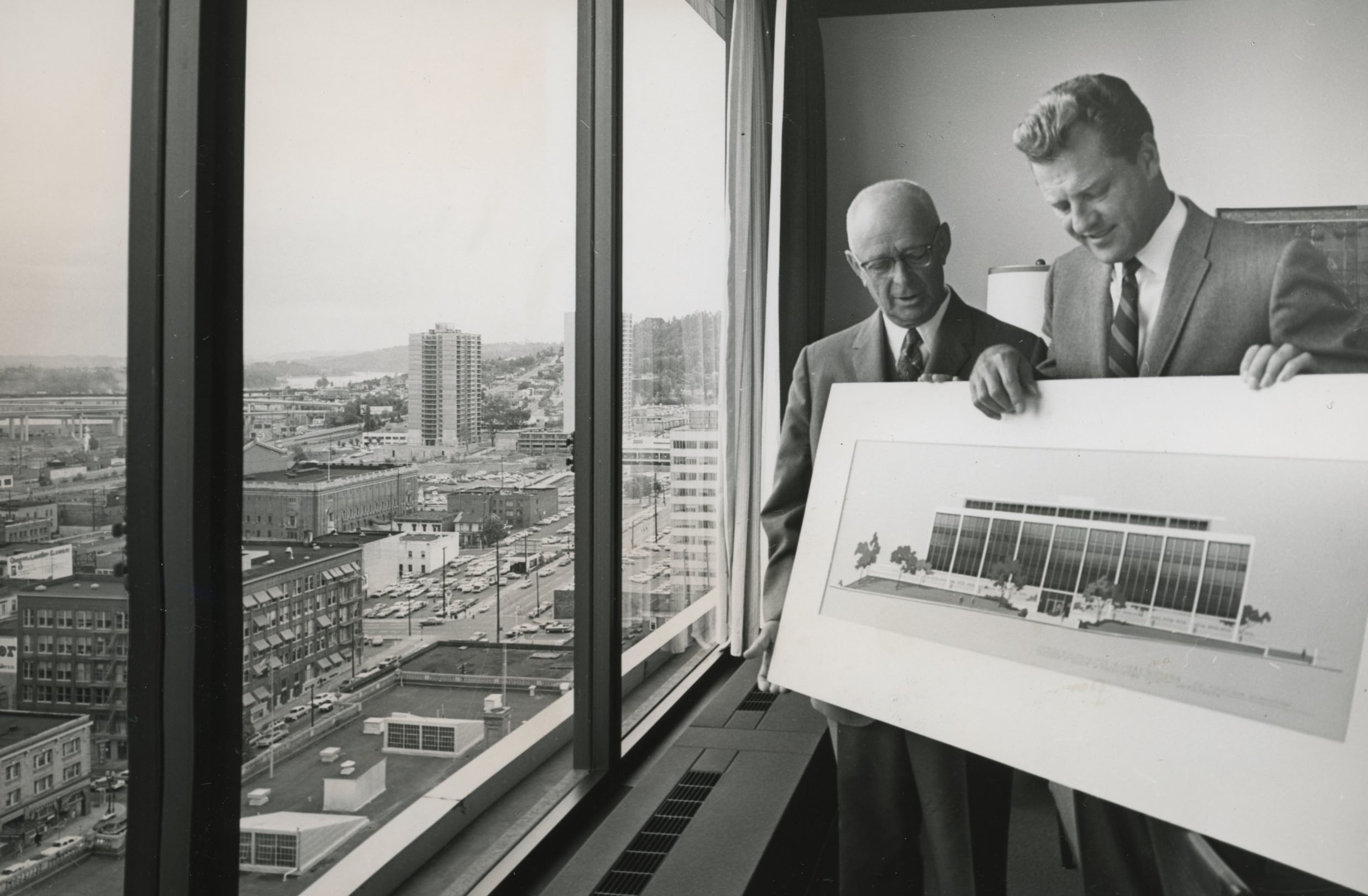 Ira Keller with Knute Qvale overlooking construction in the redevelopment area of SW Portland, 1966.