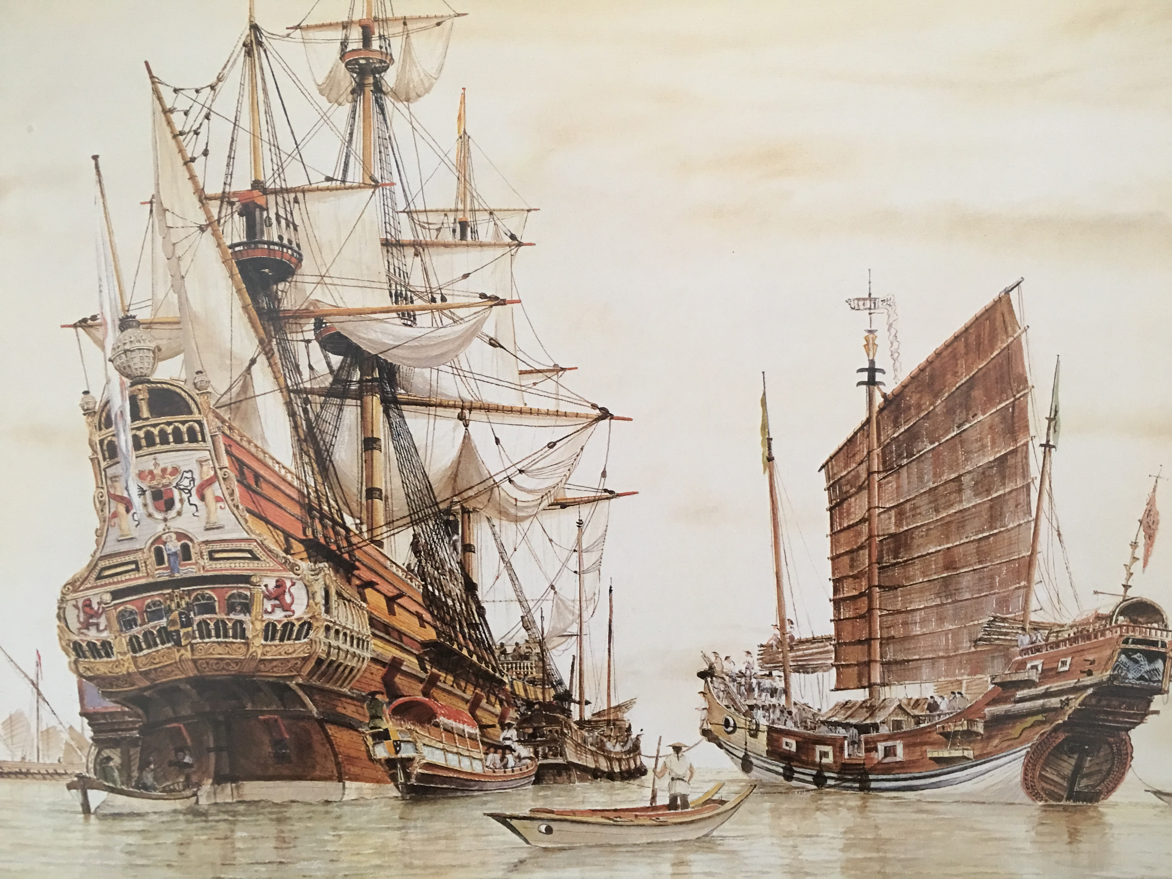 A Manila galleon (left) moored in Manila Bay trading with a Chinese junk (right).