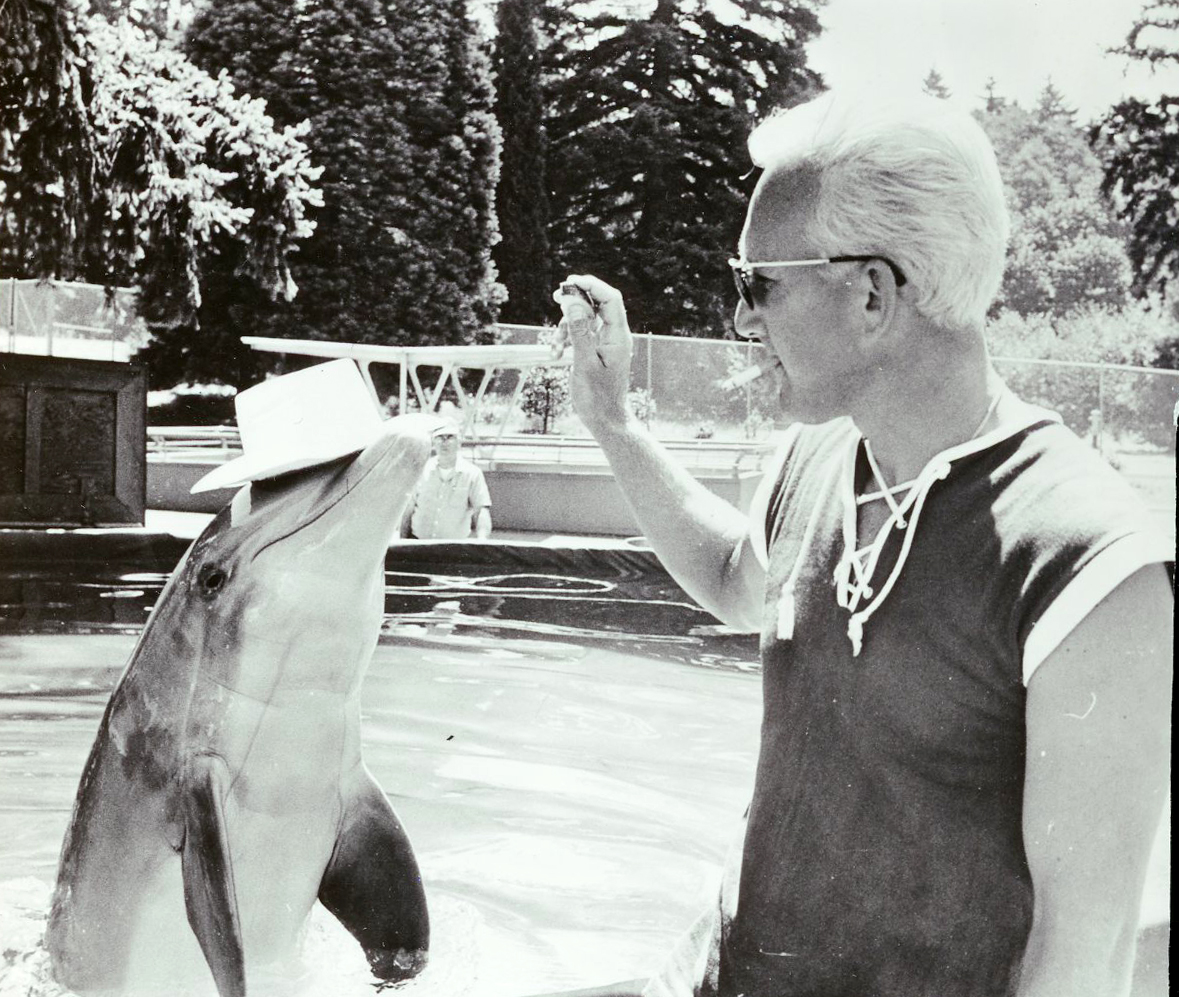 Skipper the porpoise, who performed daily at the Portland Zoo, and Don Klute, 1967.