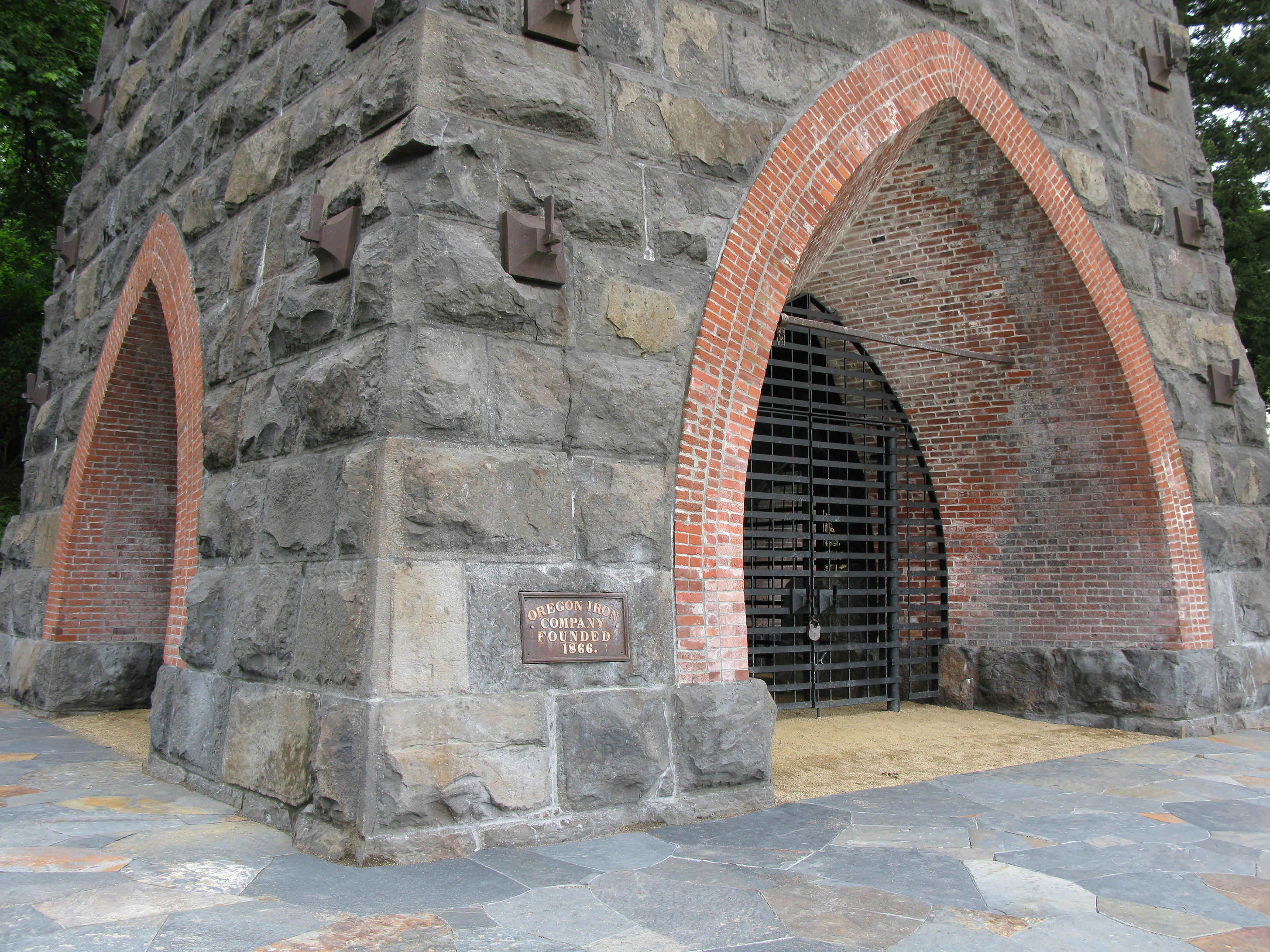 The Oswego Iron Furnace, built in 1866 at the confluence of Oswego Creek and the Willamette River, just south of Portland, was the first iron furnace on the Pacific Coast. Between 1867 and 1885, it produced 42,000 tons of pig iron, sold as Oregon Iron to foundries in Portland and San Francisco. Located in present-day George Rogers Park in Lake Oswego, the furnace is Oregon’s oldest industrial landmark and is listed on the National Register of Historic Places. It is the only charcoal blast furnace west of the Rocky Mountains.
