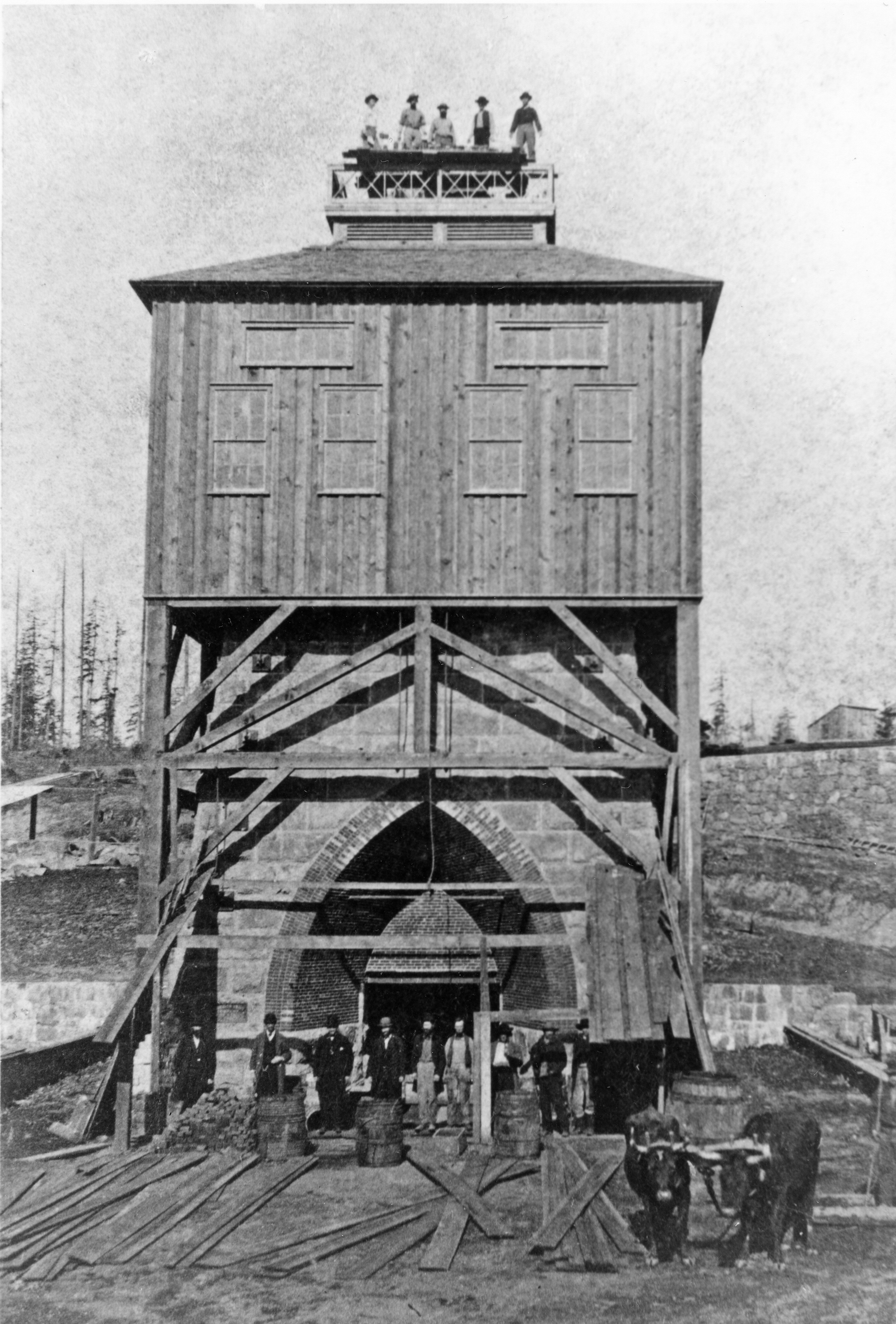 Construction on the furnace began in 1866, supervised by George D. Wilbur of Sharon, Connecticut. Wilbur modeled the stack, as stone furnaces are called, on the furnaces of the Barnum Richardson Company in Lime Rock, Connecticut. The thirty-two-foot stack is shaped like a truncated pyramid with gothic arches piercing its four sides. The massive walls were built to withstand temperatures of 2,800°F. Payrolls show that forty-two quarrymen, masons, and carpenters were engaged in construction. Basalt for the stonework was quarried from a ledge on the north side of Sucker Lake. Firebrick for the shaft, the chimney, and the heat exchanger was imported from Britain. A large complex of buildings surrounded the furnace.