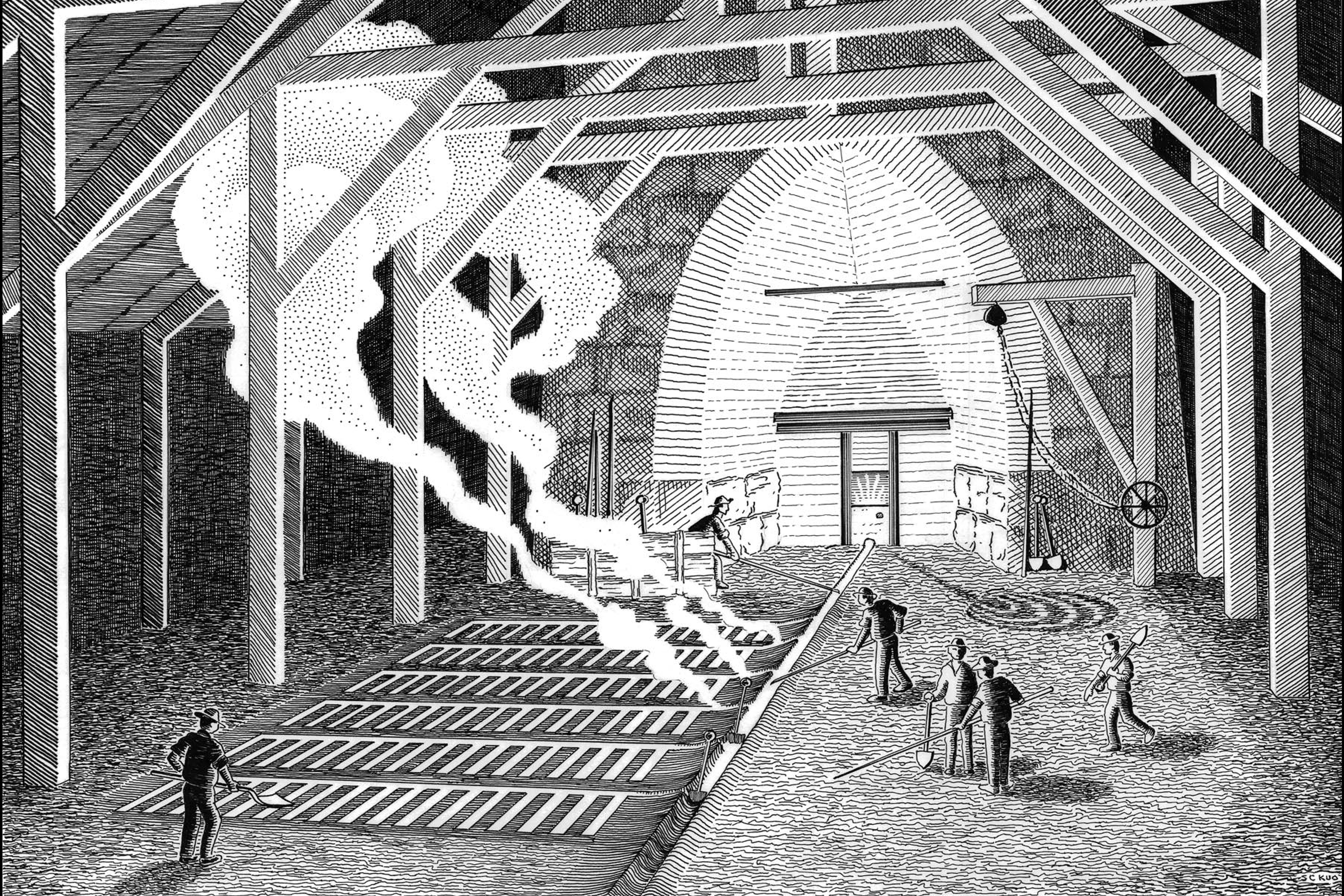 The furnace was “blown in” on August 22, 1867, amid high hopes that Oswego would become the “Pittsburgh of the West.” Charcoal, ore, and limestone were fed into the top of the shaft, and air was injected into the bottom through three ports in the smelting chamber. Molten iron was tapped through the casting arch. The first iron was cast on August 24, 1867. When the tap hole was opened, a stream of incandescent iron poured down a channel and filled a series of molds in the sand floor of the casting house. The ingots have been called pig iron since at least the mid-seventeenth century because the layout of trenches reminded workers of a sow nursing piglets.