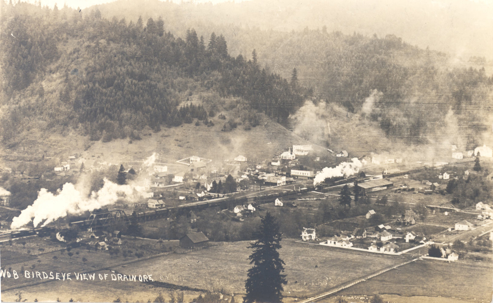 In 1861, Charles Drain bought a 320-acre donation land claim from Jesse Applegate. He sold 60 acres of the claim to the Oregon & California Railroad for a dollar in 1872 and platted the town. In 1876, an extension of the Overland Stagecoach was opened from Roseburg to Scottsburg on the Oregon Coast, with Drain as the northern stopping point. The original Pass Creek Bridge, a covered wooden bridge, was built in about 1876 adjacent to a wooden covered railroad bridge as part of the Overland route. This road was one of the primary routes to the coast until 1906, when the Southern Pacific Railroad constructed a line from Eugene to Coos Bay. The site of the Overland Stagecoach route and original bridge over Pass Creek was on North First Street.