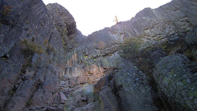 Radial dikes, or radial intrusions, are visible to the east of the base of Pilot Rock. The dikes formed as the landscape bulged upward during the volcanic intrusion and split the existing rocks; magma filled the cracks that radiated out from Pilot Rock.
