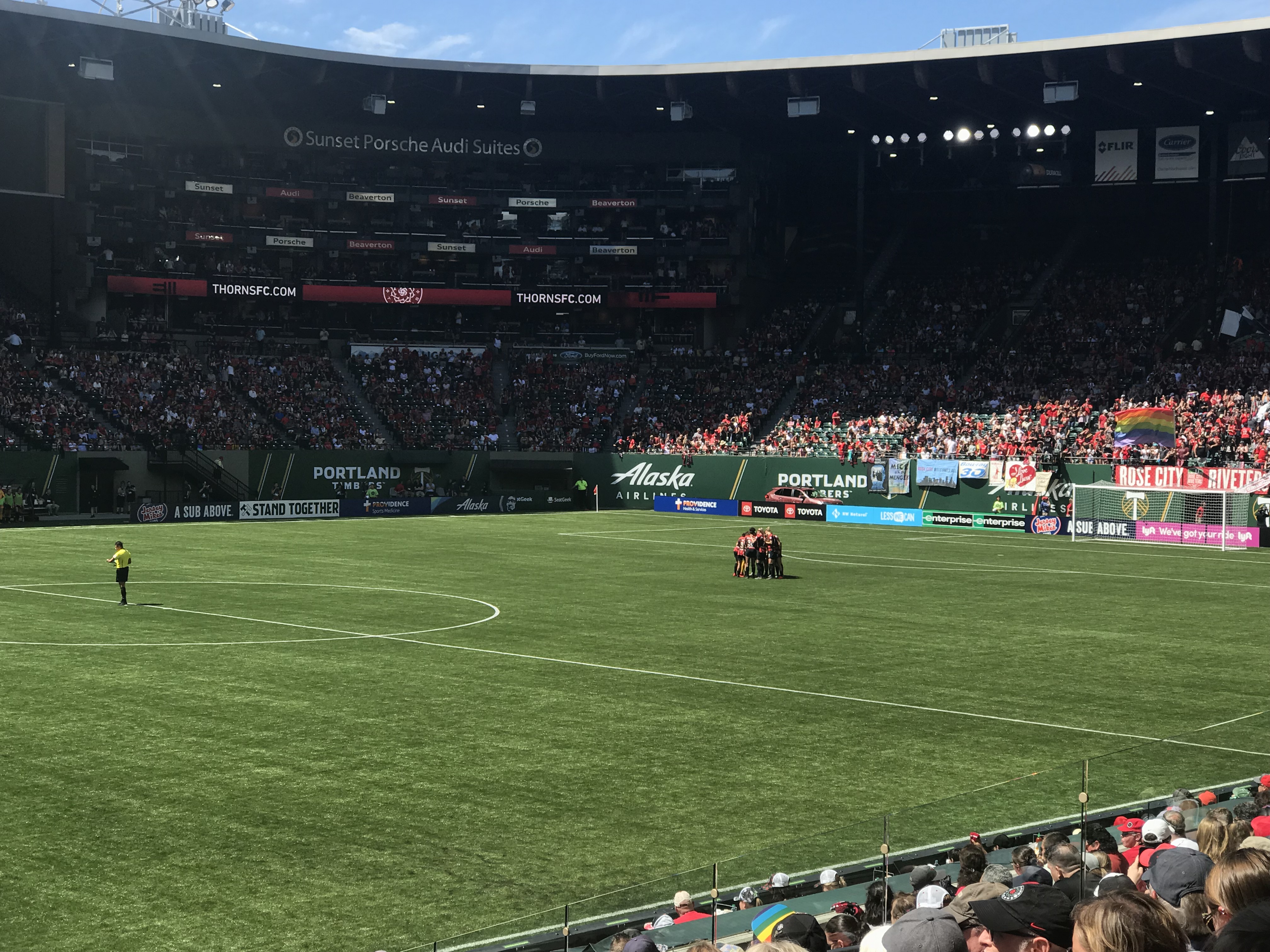 The Thorns in a pre-game huddle, Providence Park, June 2, 2019.