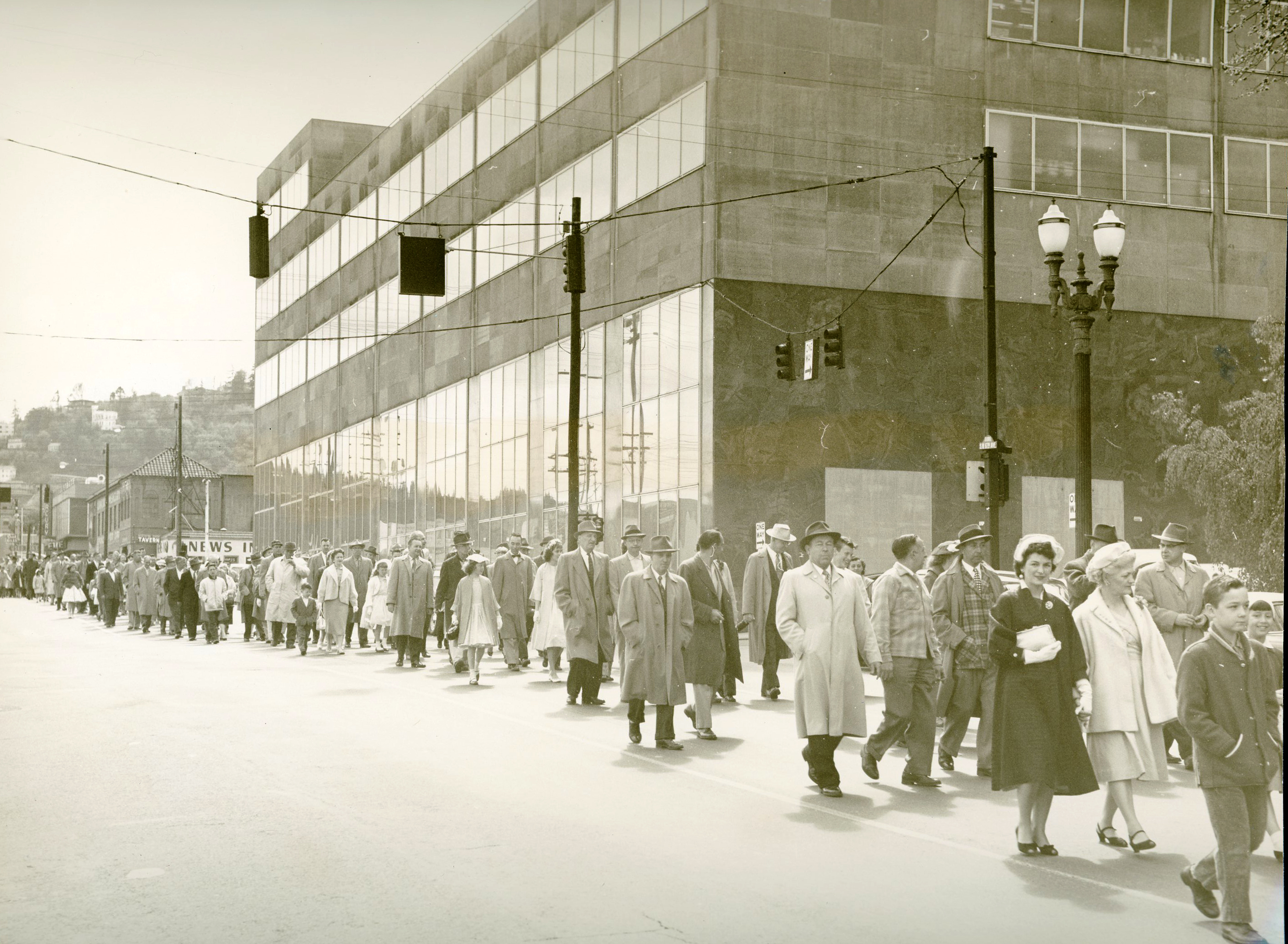 Staff of the Portland Reporter on a protest march past the Oregonian building, April 1960.