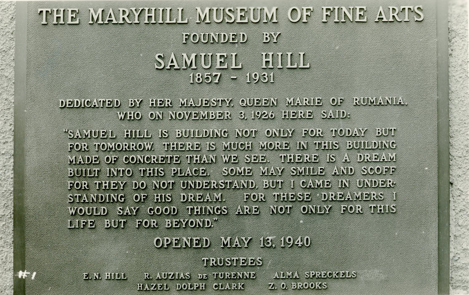 After a New York ticker-tape parade and a White House state dinner, Queen Marie and Hill arrived at Maryhill by private train on November 3. In her diary, Marie called Maryhill “a strange uncouth cement building erected by the just as strange Samuel Hill.” To the crowd of 2,000 that had gathered for the dedication, however, she said: “There is a dream built into this place…Sam Hill is my friend. He is not only a dreamer but he is a worker….So when Samuel Hill asked me to come, I came with love.” The New York Times and other national press covered the event, and the Oregon Daily Journal chartered an airplane to take aerial photos.