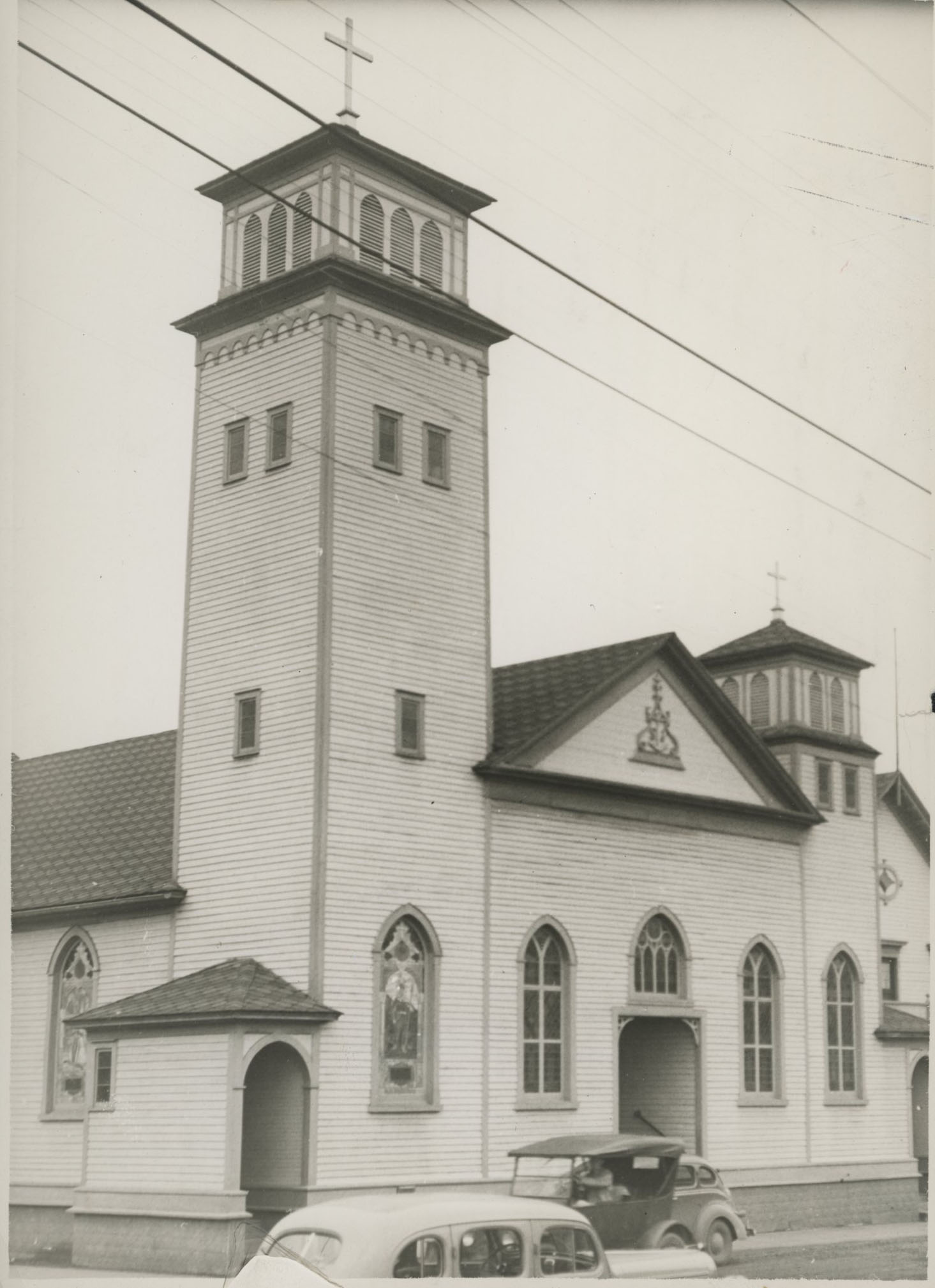 The original chapel and other buildings that constituted St. John the Apostle parish were razed in 1947. After World War II, new facilities were constructed at its present location on Washington Street. The building, along with a free-standing seventy-one foot tower with a fourteen-foot high gold anodited aluminum cross, was dedicated in 1957.
