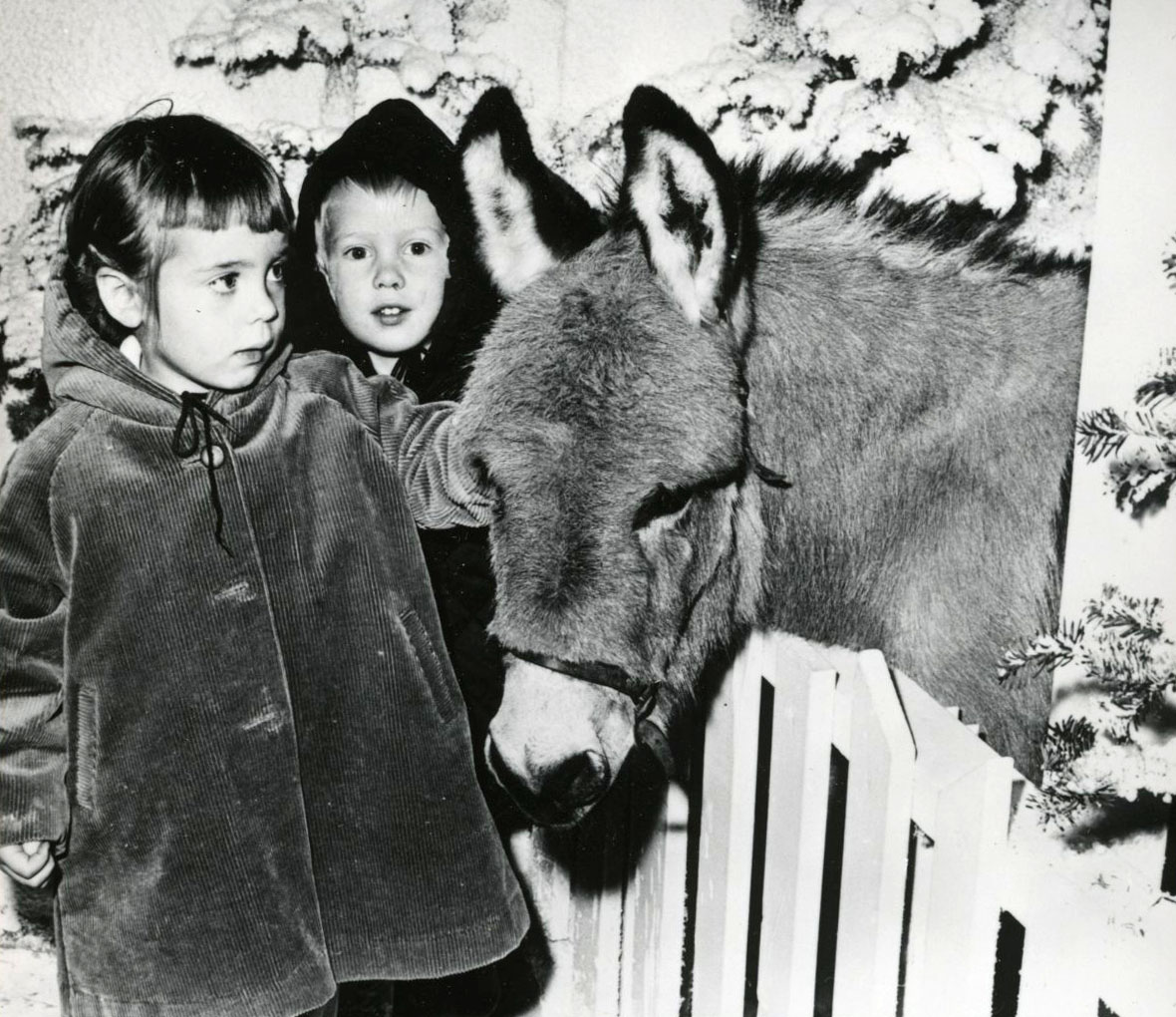 Children visit animals at the Alpenrose Storybook Lane in the Lloyd Center during the winter holidays, 1965.