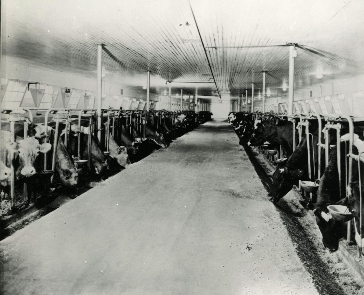 Cows lined up in the milking shed at Alpenrose Dairy, c.1930.