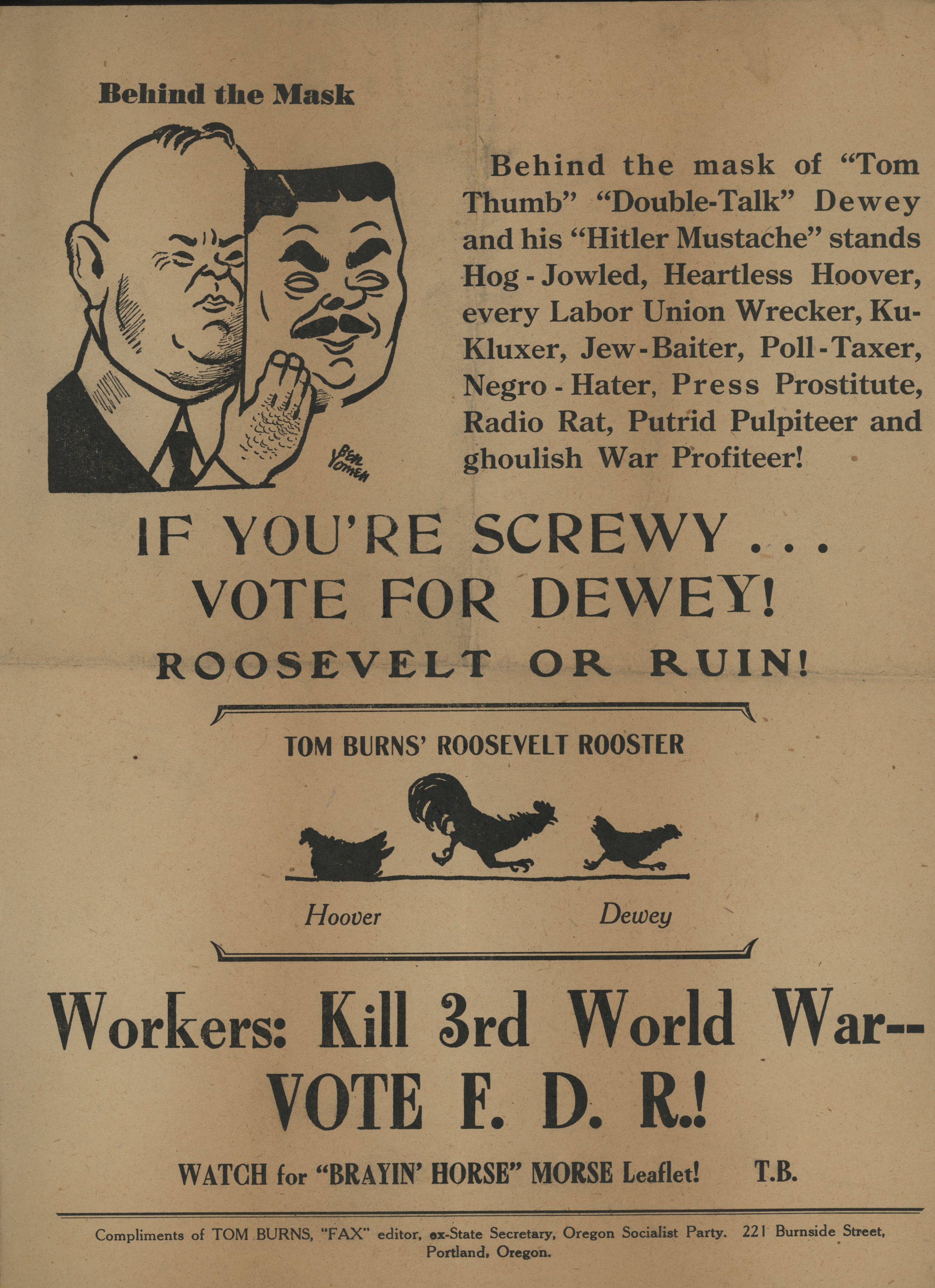 Anti-Dewey, pro-FDR poster from the 1944 presidential election, likely posted in Burns's shop window..