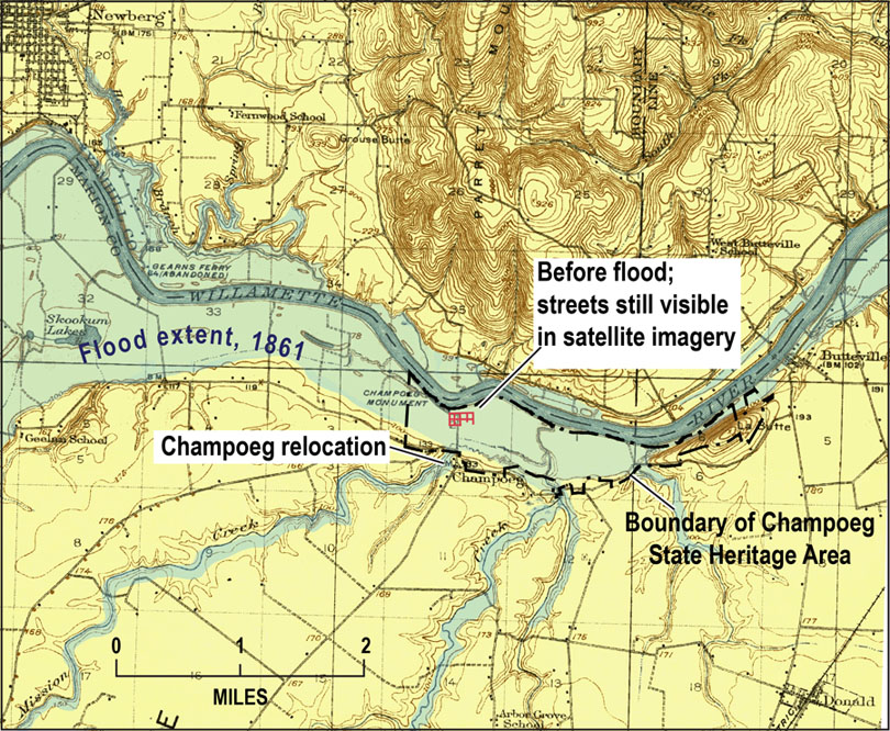 In December 1861, a warm Chinook wind melted snow in the Cascade Mountains and, combined with continual rain, caused the Willamette River to flood. The flooding reached its height on December 5 and 6, covering Champoeg with about 30 feet of fast-moving water and sweeping away all of the town’s structures except the Hudson’s Bay Company warehouse. While there was no loss of life at Champoeg, the community vanished. After the flood, “one saw only drifting sand, and land denuded of its soil marked the abandoned townsite,” according to a recollection by Samuel Asahel Clarke. The flood of March 1890, which very nearly equaled that of 1861, again scoured the townsite.