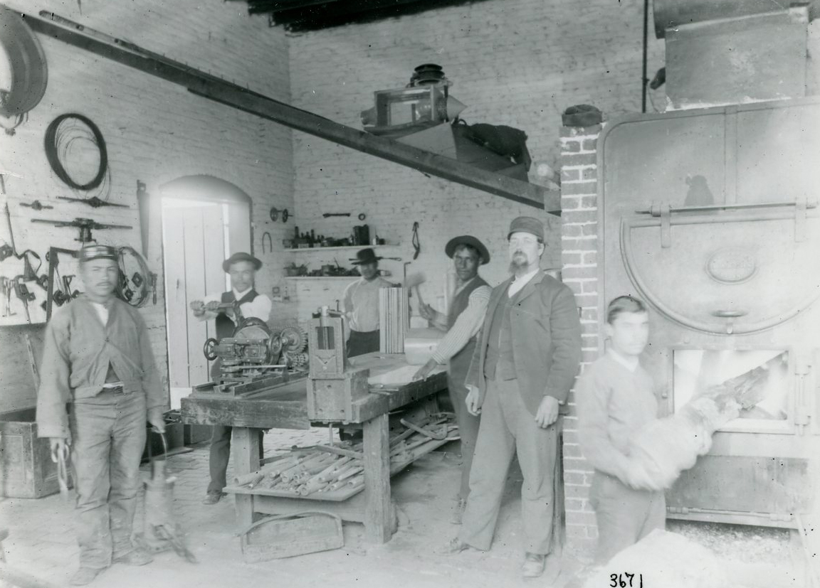 Students and instructors in the Chemawa machine shop, 1887..