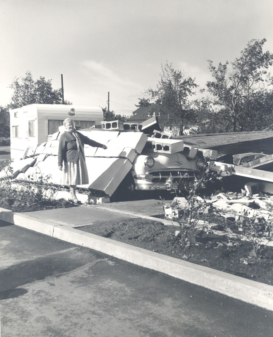 Jim Johnston of Portland stands next to storm damage of his home. Courtesy Oregon Hist. Soc. Research Lib., acc27750