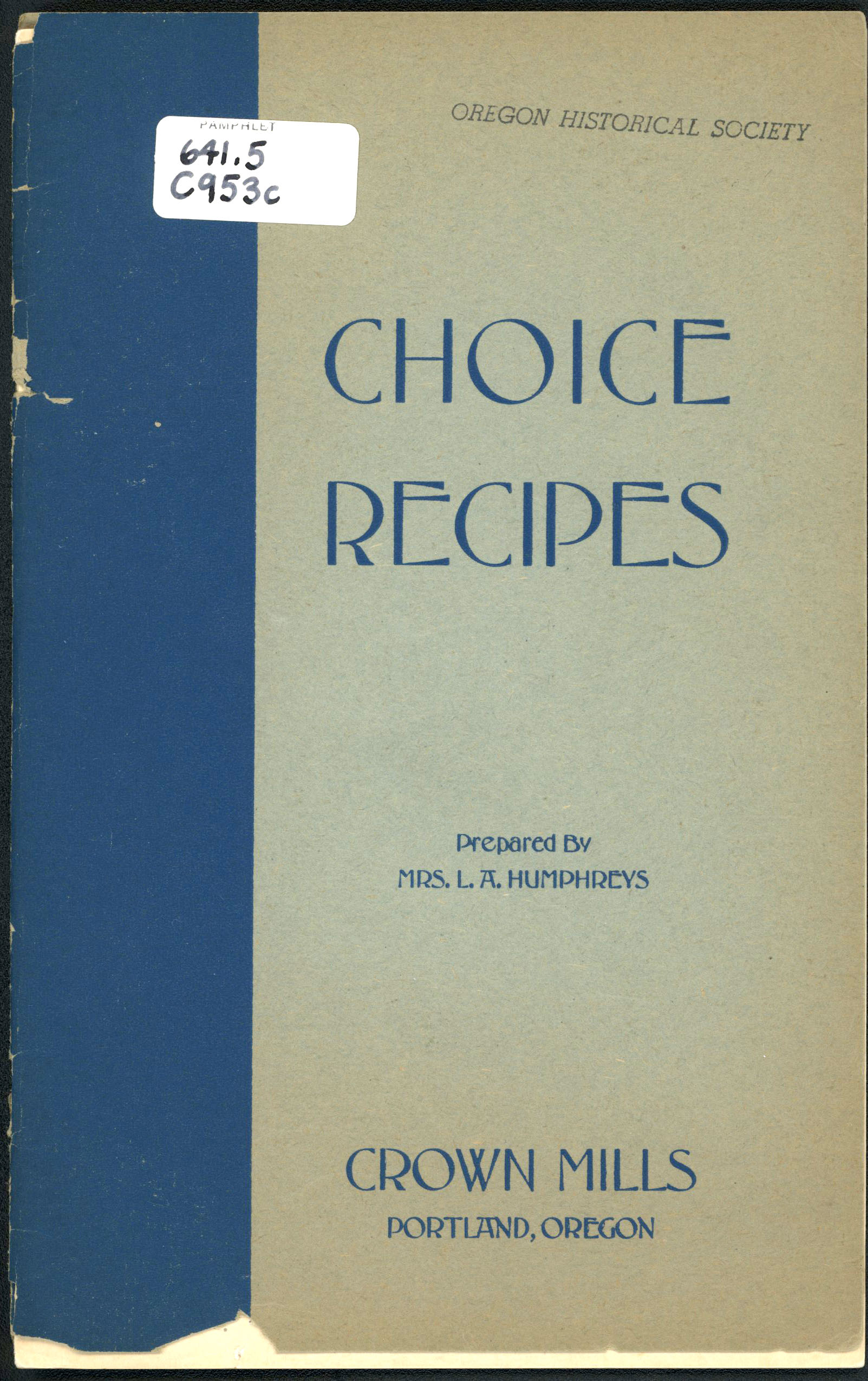 Humphreys, Mrs. L(eanna) A. Choice Recipes, Portland, Ore.: Crown Mills, printed by the Hefty-Belding Printing Company, c1920.