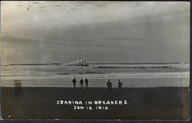 The Czarina left Coos Bay on January 12, 1910, headed for San Francisco with a cargo, estimated at $20,000 in value (over $500,000 in 2019 dollars), of cement and coal belowdecks and 40,000 board feet of lumber lashed to the decks. The ship departed as a southwesterly gale was blowing and a high sea was breaking over the Coos Bay bar. The ship ran into trouble even before reaching the open sea, and onlookers later reported that it looked like the engines or perhaps the steering apparatus had been disabled. The Czarina grounded on South Spit, having already breasted sixty-one breakers, passed over the Coos Bay bar, and drifted northward along the beach.