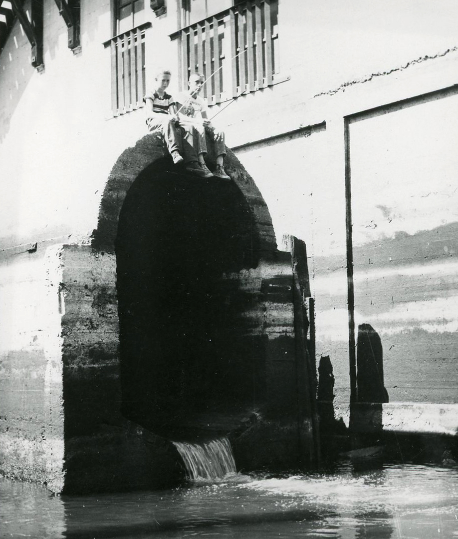 Boys fish over the Crown Mill sewer outflow, 1960.
