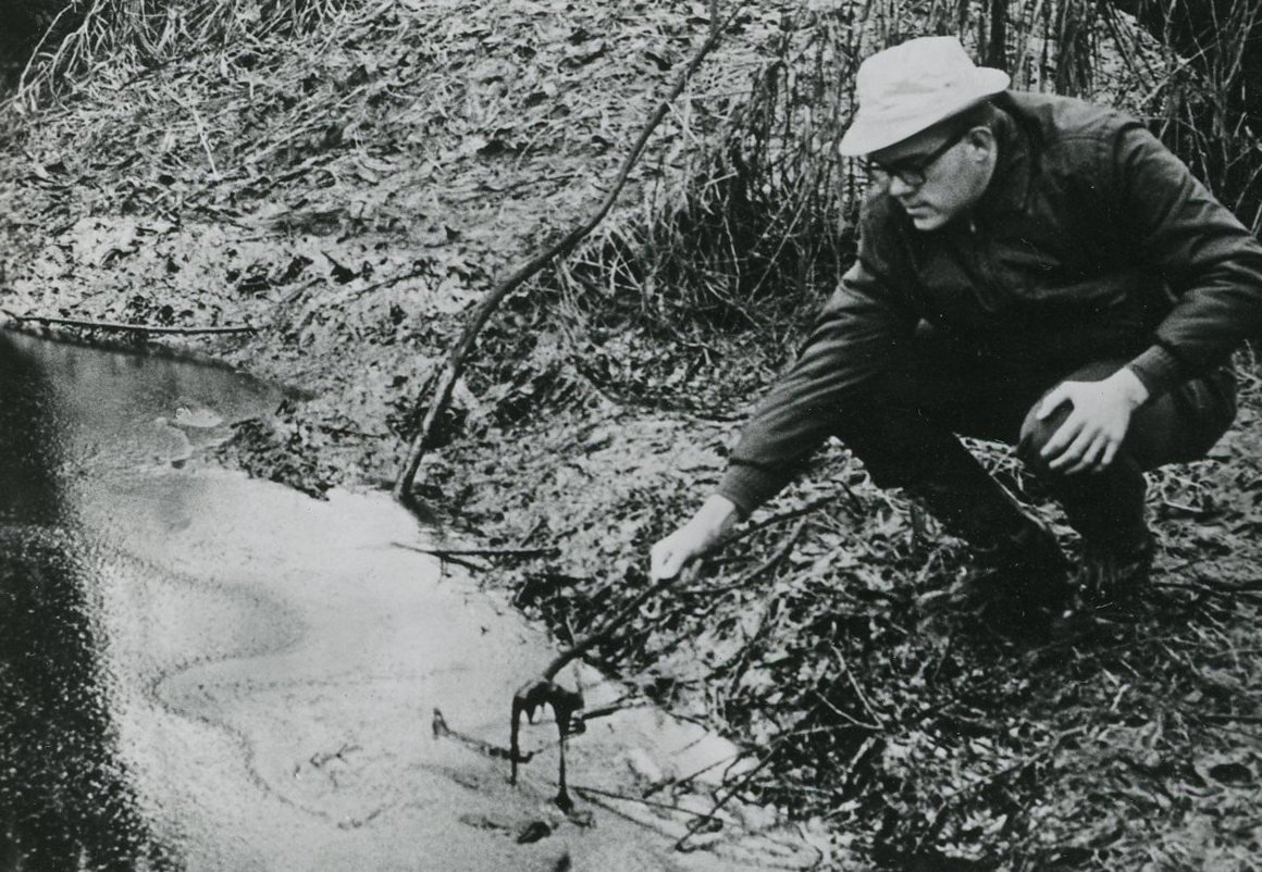 Sanitarian Bob Jackson inspecting Milton Creek for pollution, 1970.