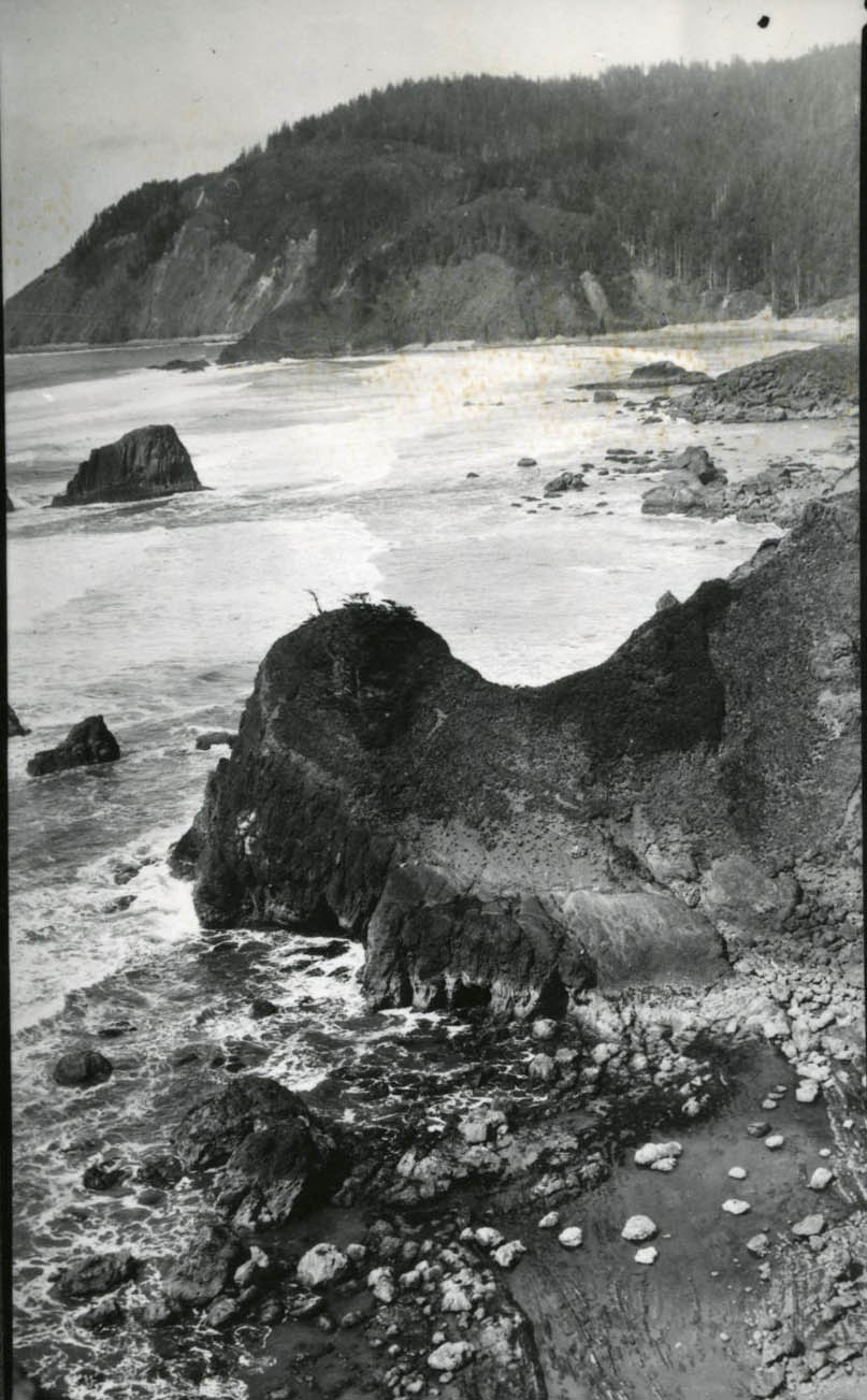Looking north at Indian Beach, Ecola, Tillamook Head in distance, 1934.