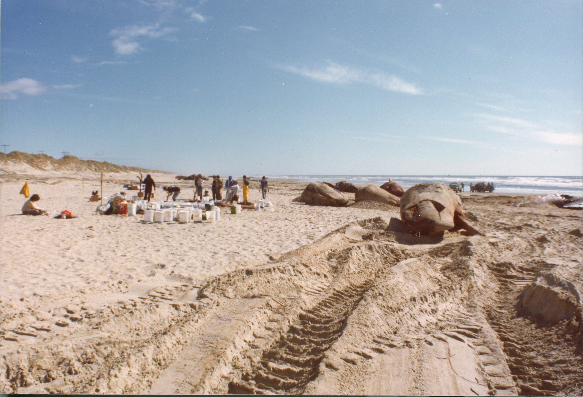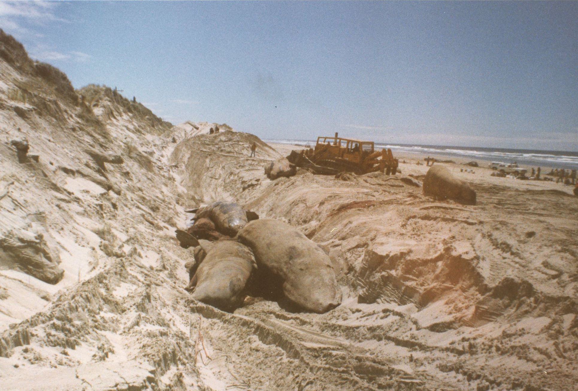 Whales buried in the sand after beaching on coast near Florence, 1979.