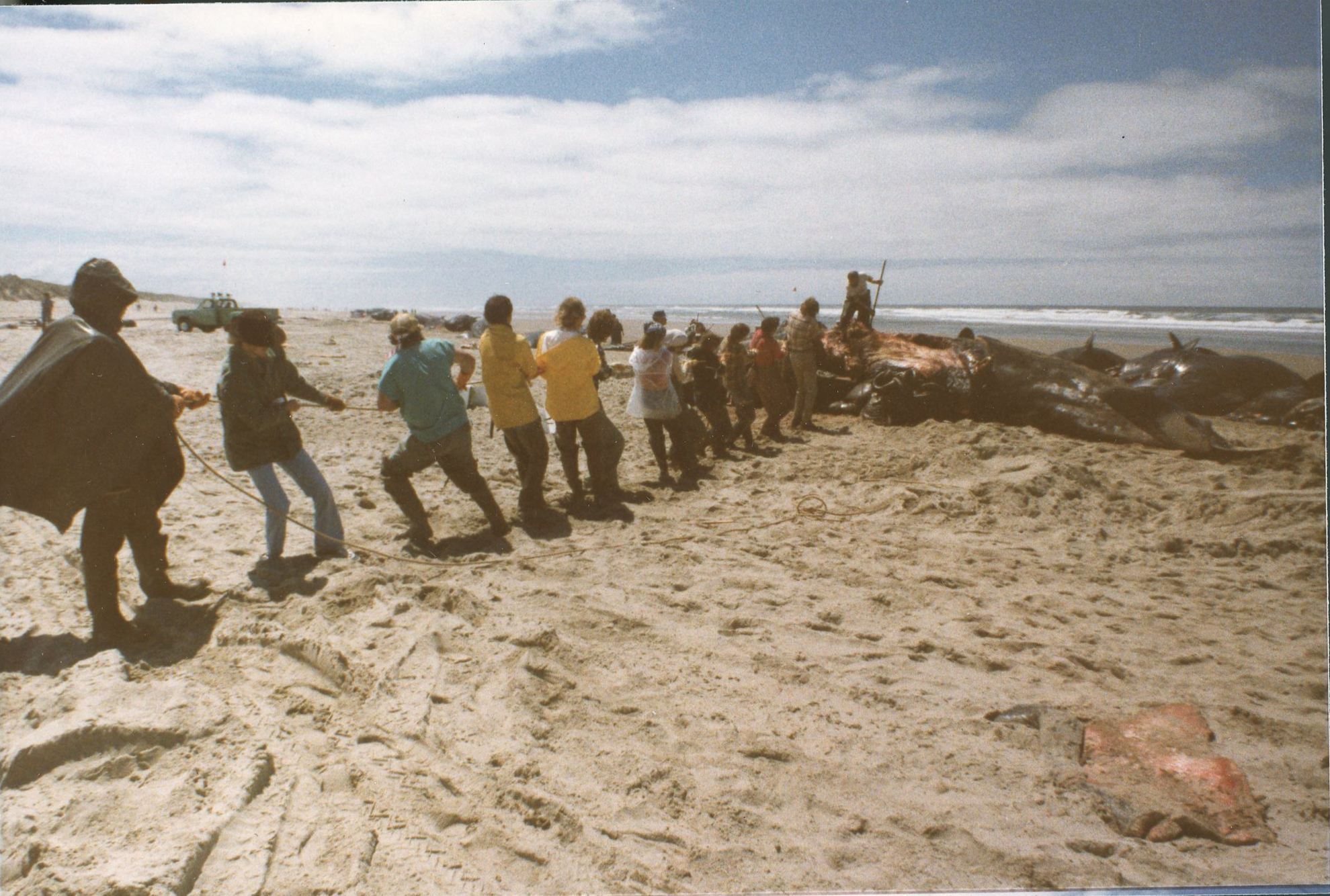 Whales being pulled to trenches, coast near Florence, 1979.