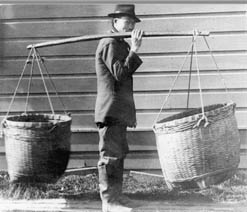 Chinese gardeners on 50' trestle over Tanner Creek (today SW 18th Ave), c. 1880s.