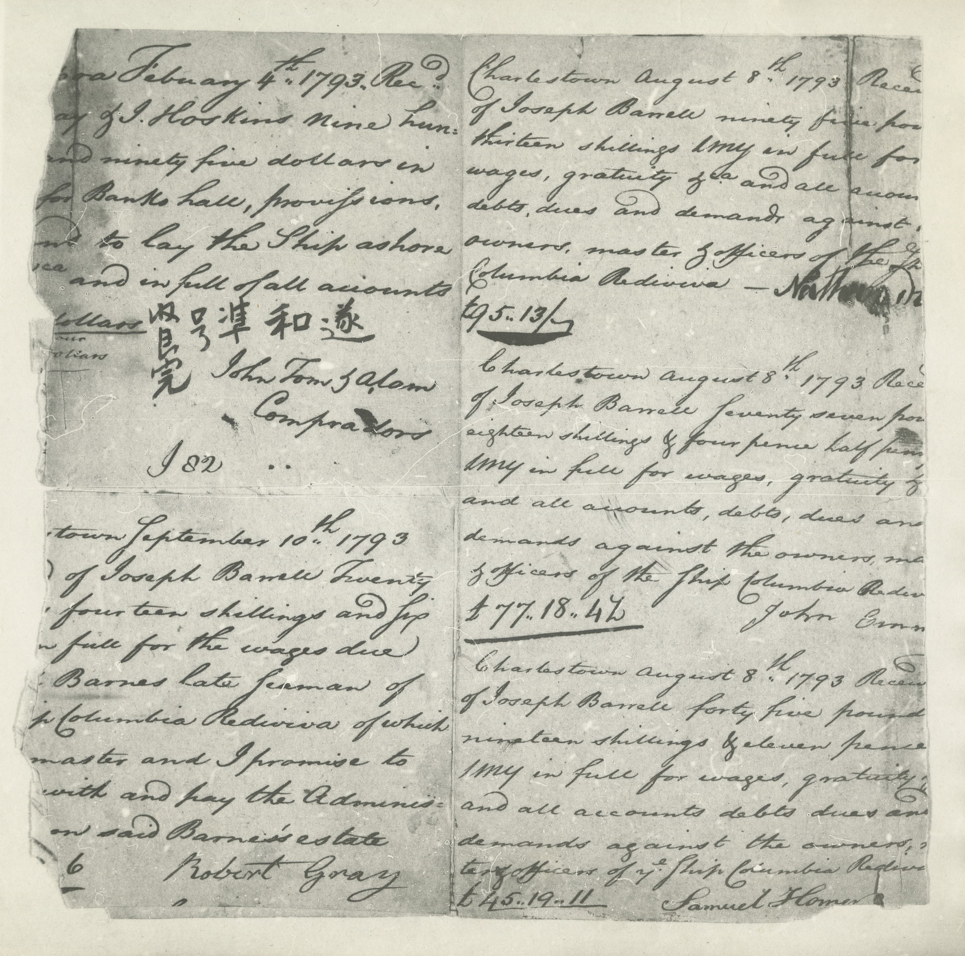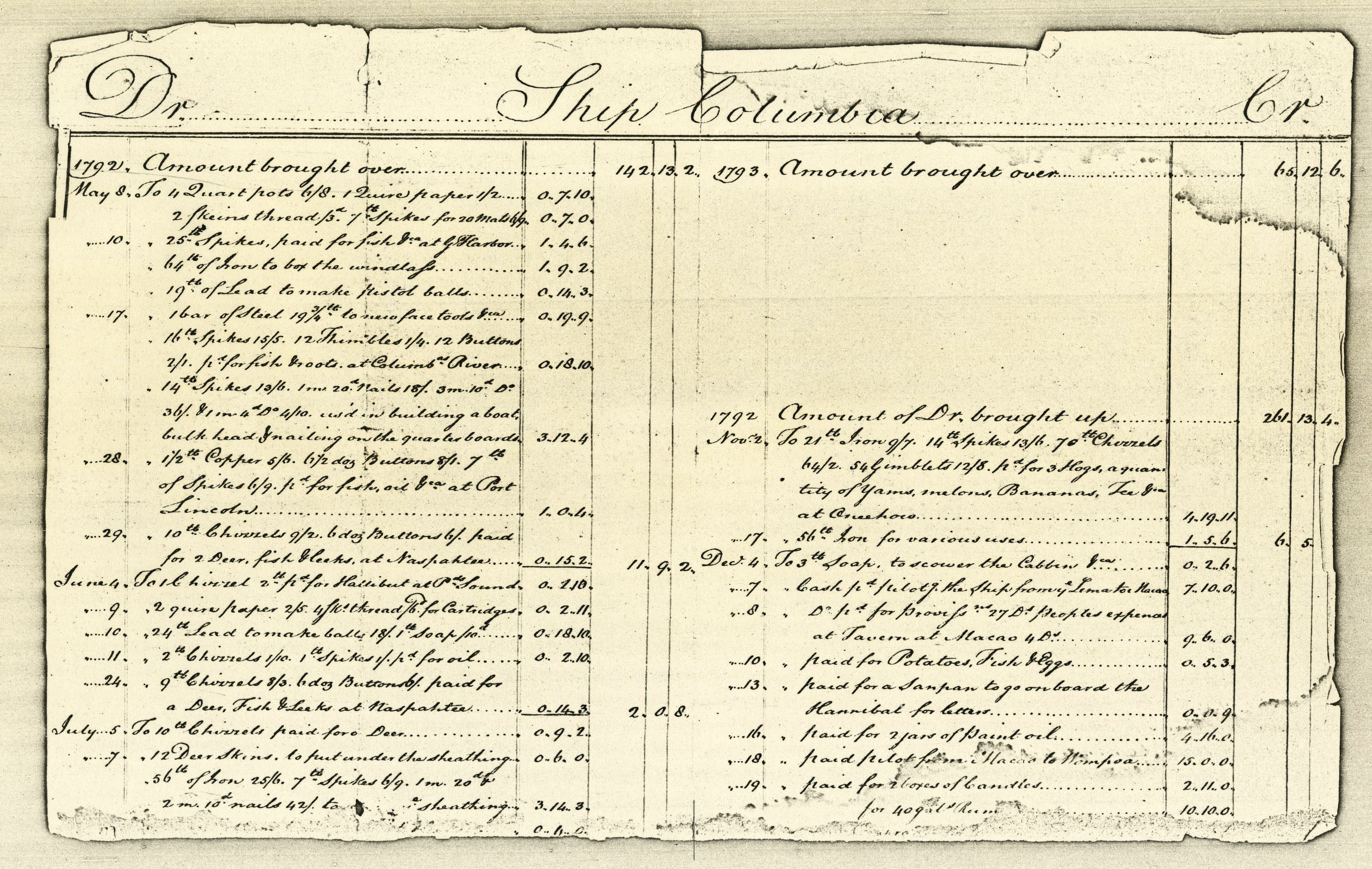Accounting receipt from the Columbia Rediviva, 1792.