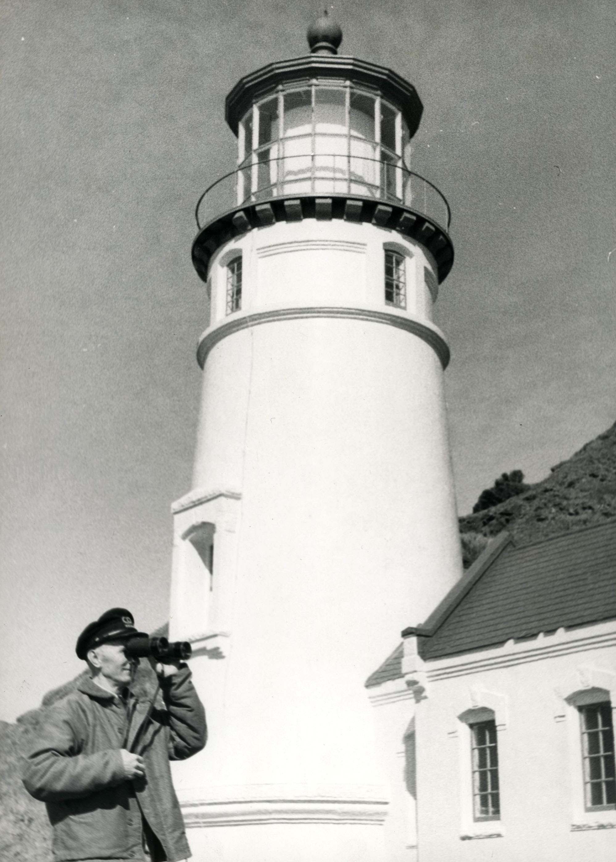 Heceta Head Lighthouse, 1931. Keeper waves from the walkway..