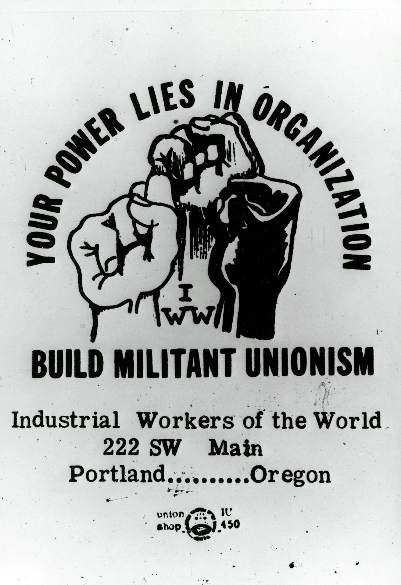 The Industrial Workers of the World (IWW or "Wobblies"), founded in 1905 and crushed for its opposition to World War I in 1917-1918, was the most active and most actively opposed revolutionary union of its time. In Oregon, the IWW was rooted in lumber camps and mills in the western part of the state and among field hands in eastern agricultural areas. Working conditions were poor in those industries, and employers strenuously fought unionization, particularly by the IWW, which refused to make agreements with capitalists and advocated sabotage on the job.
