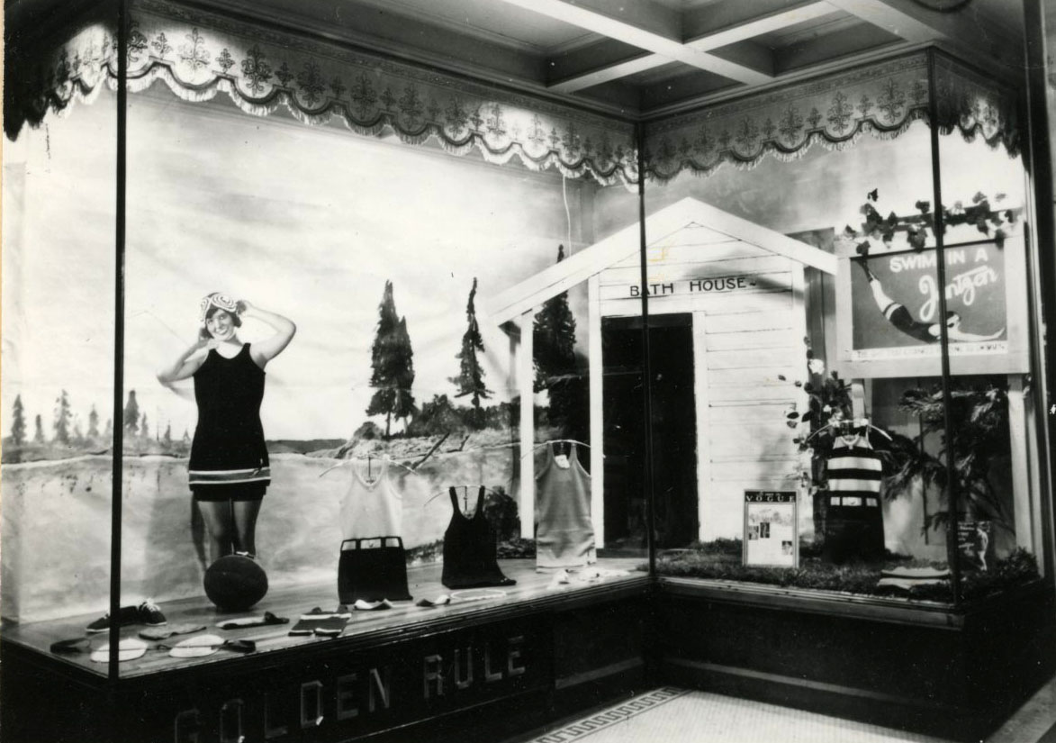 Jantzen window display in Golden Rule chain store, Grants Pass, 1928.