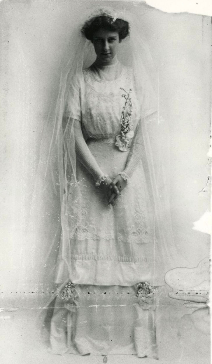Gladys McKenzie Hug, wearing a Shogren-made wedding dress, 1910.
