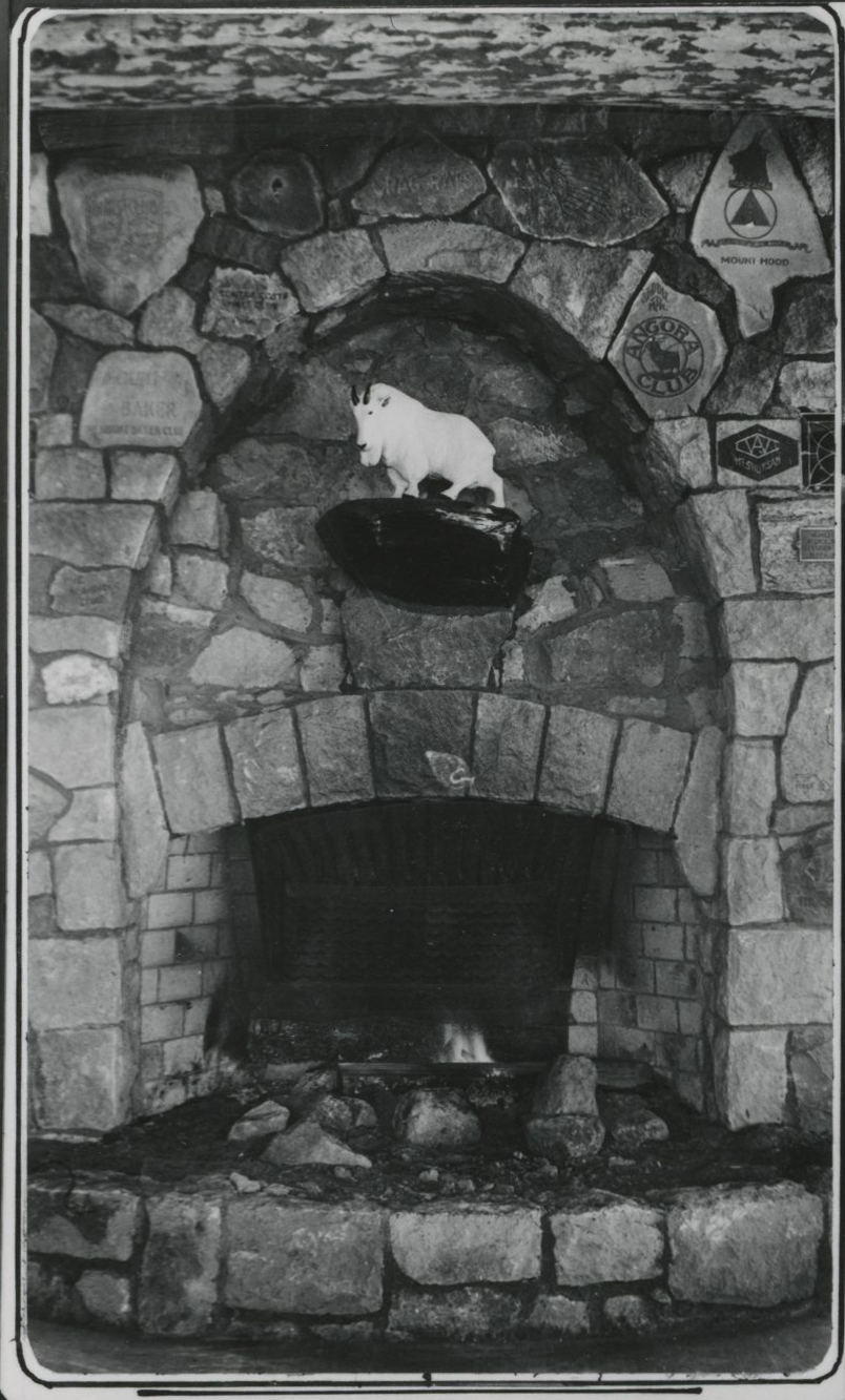 Fireplace in Mazama Lodge, made with stones gifted by other western clubs, 1931.