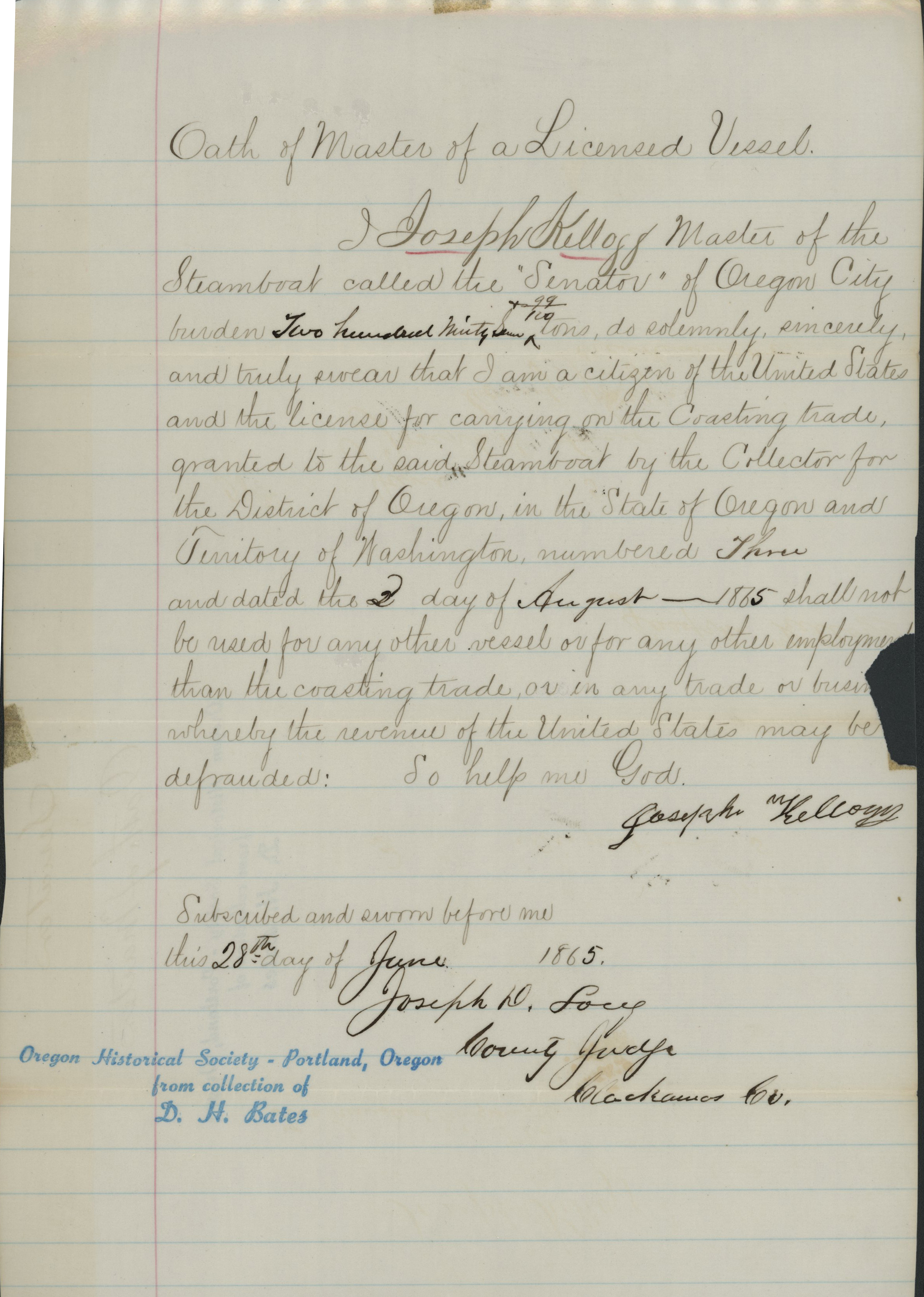 Capt. Kellogg's steamboat trade license, 1865.