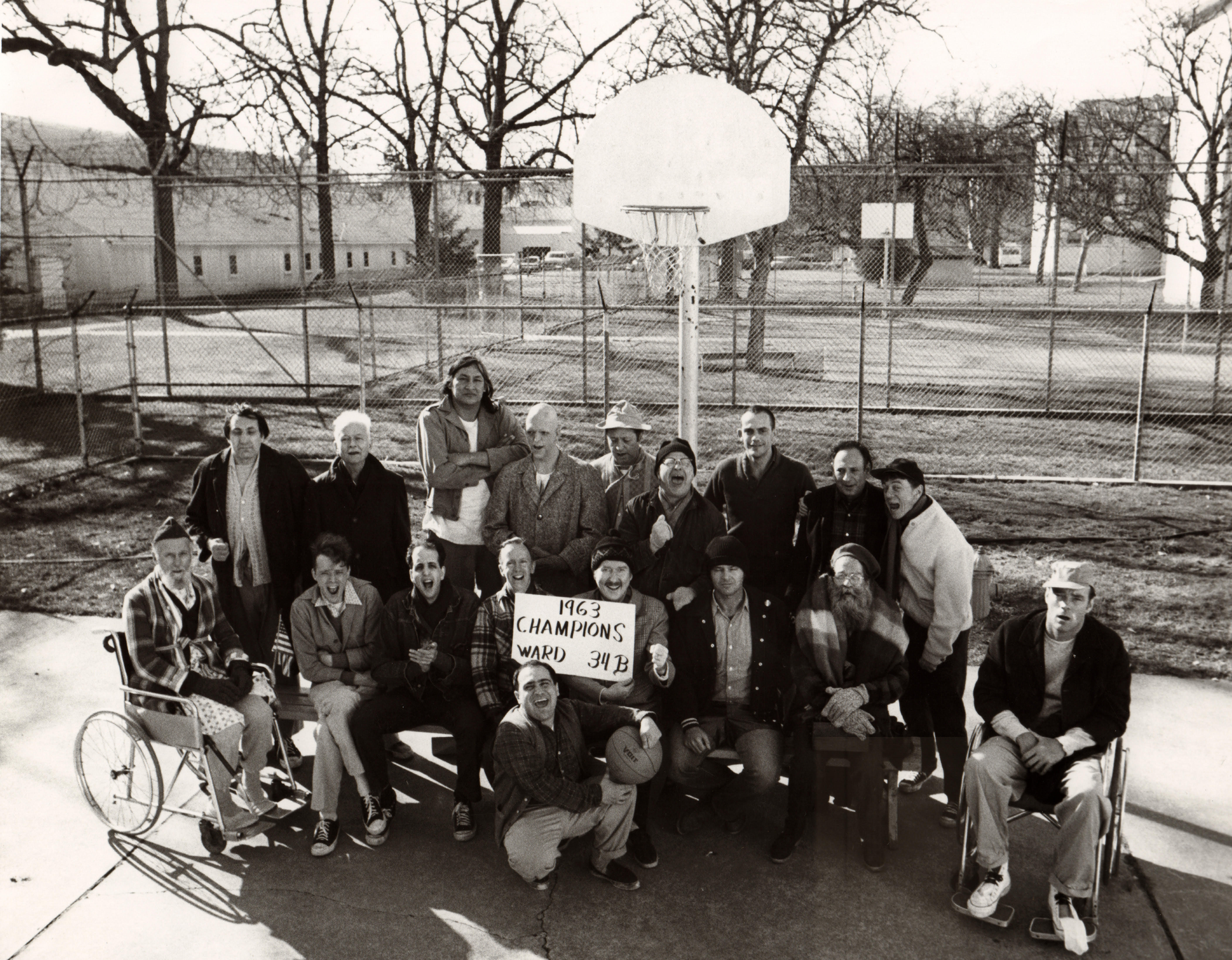 The cast posing outside on the basketball court at the Oregon State Hospital..