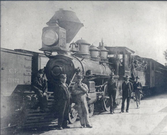 Rev. Parrish drives the first spike for the Oregon Central Railroad, at E. Washington and 1st Ave., Portland. Courtesy Oreg. Hist. Soc. Research Library, OrHi6884