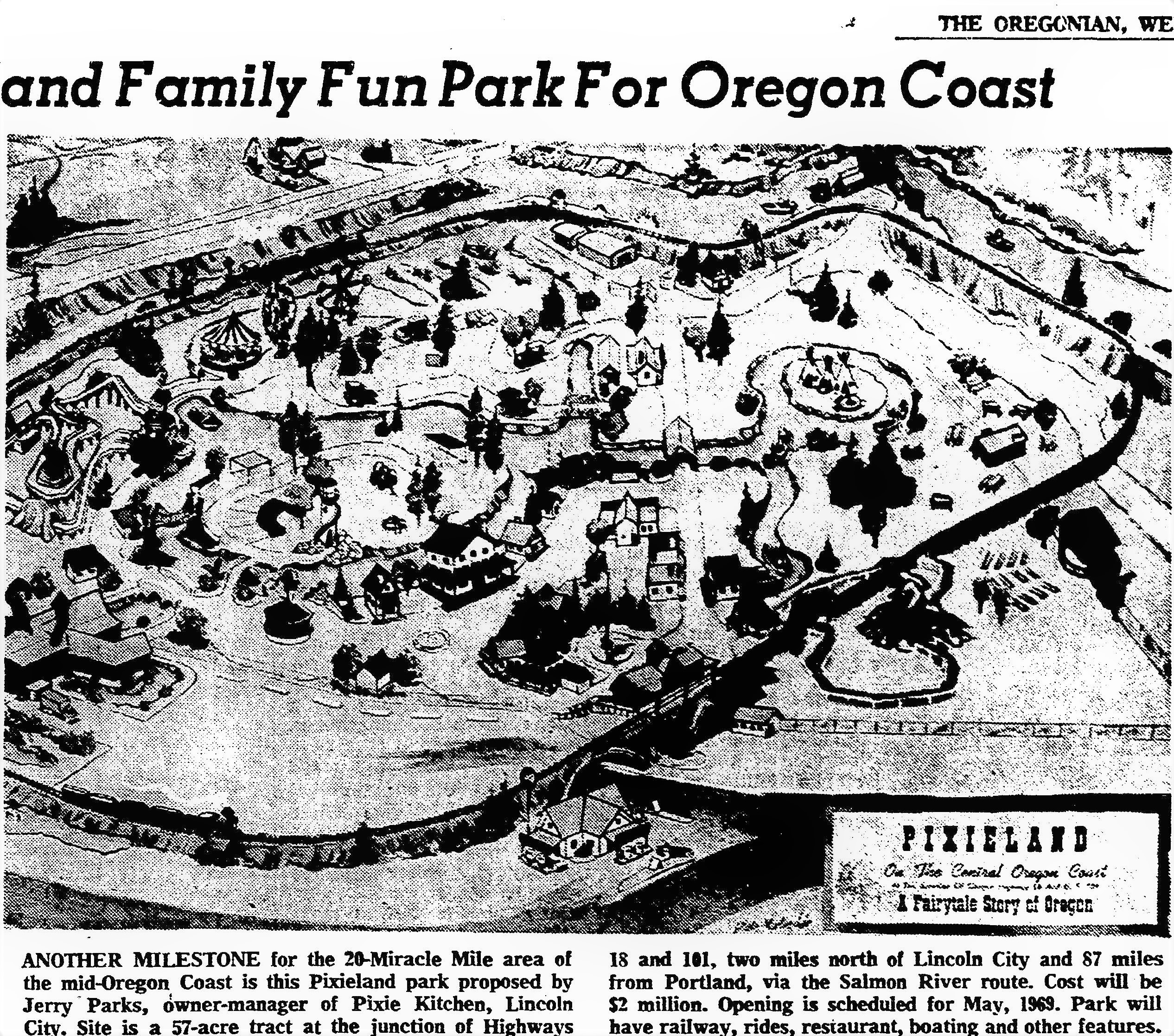 The Pixie Kitchen was so popular that Jerry Parks decided to build an amusement park. He purchased 57 acres of Salmon River wetlands in 1964 and spent $300,000 diking, draining, and filling the land. In 1966, he told the Lincoln City News Guard that Pixieland would include “pioneer-type buildings,” train rides, and a larger restaurant. He hired two people who had worked at Disneyland to help design and build the park and to oversee its operation. To finance the project, Parks received a $250,000 Small Business Administration loan and offered 500,000 shares of stock at a dollar a share, which sold out in an in-state offering in three weeks. The final cost of the park was an estimated $2 million.